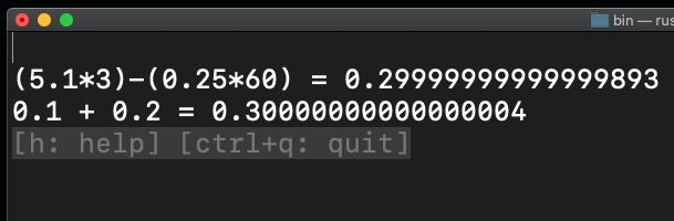 For evaluating math expressions, the eval crate did the job very easily*. But because my goal for the app was to use it for everyday financial calculations (I am a major spreadsheet user for my personal finances) I couldn’t stand the use of floating point math within the eval crate. I needed to implement math using a library similar to Java’s BigDecimal.