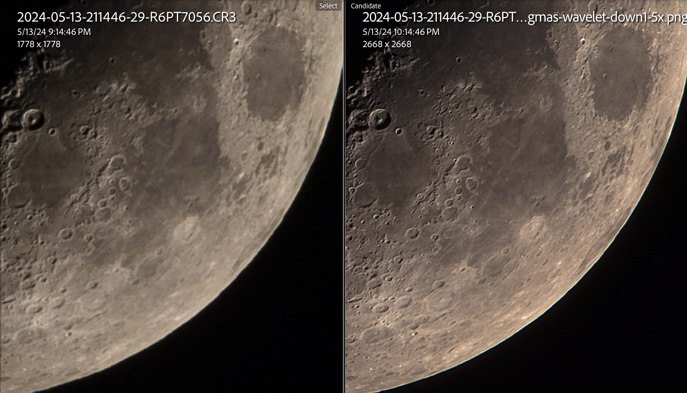 Even when resized back down to original size, you can see that the stacked image (the one on the right) retains more detail especially in the more distant parts of the Moon visible toward the edge of the lunar disc.