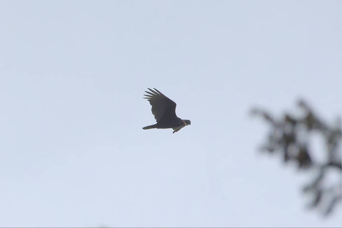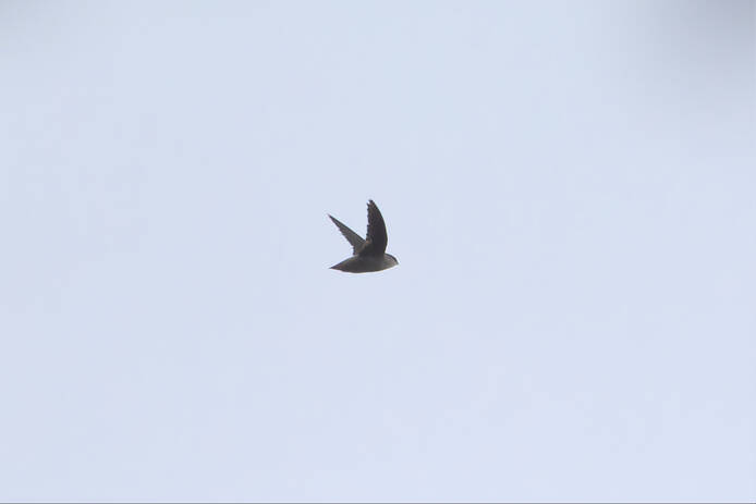 Vaux's SwiftThe Merlin iPhone app repeatedly identified Vaux's Swift calling, and there were 3 of them flying very fast over the neighborhood for a while. It was not easy to point the camera up between all the trees to get a shot of one in flight, but I think in this shot the bird is identifiable as a Vaux's Swift.