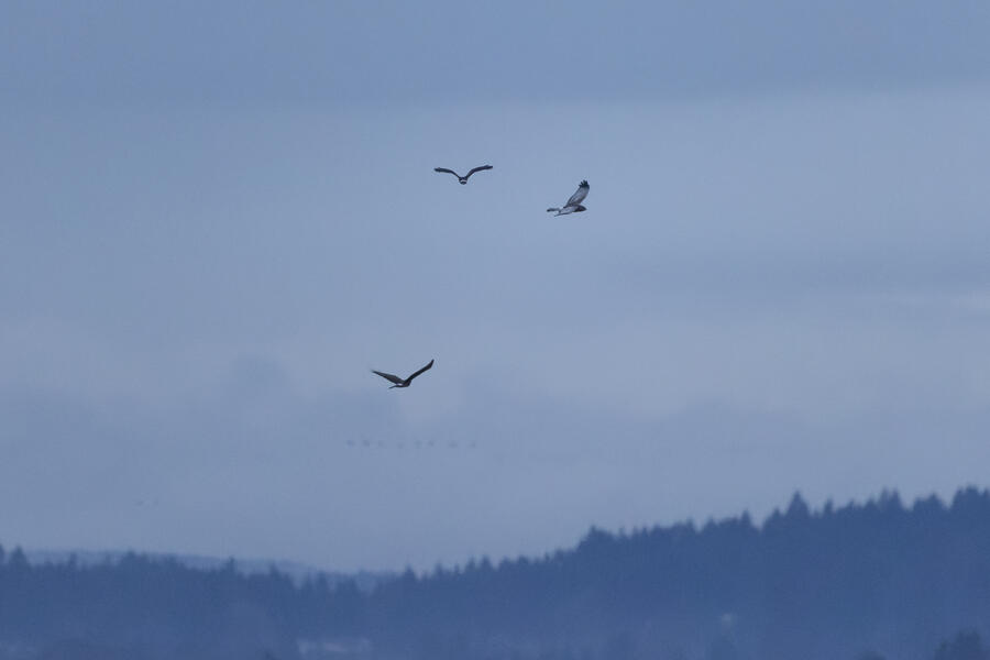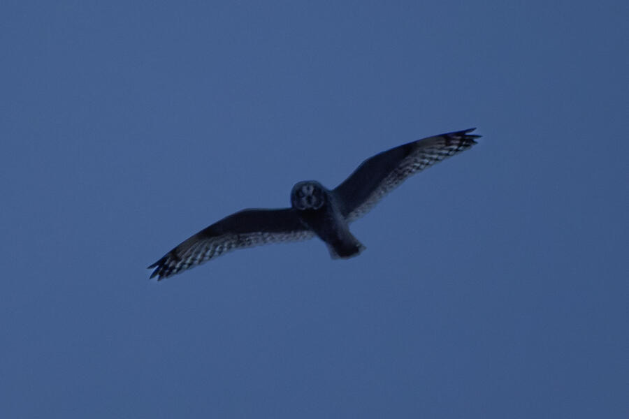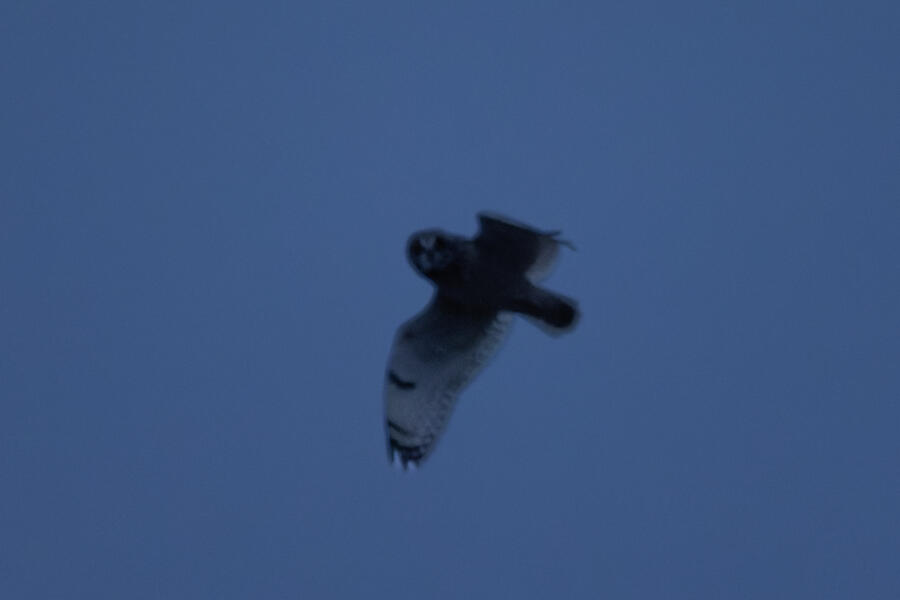 I'd seen many reports of Short-eared Owl at the local wildlife area. On a relatively dry evening, at sunset, I took my nearly 4-year-old daughter and we went looking. I saw a few Northern Harriers hunting there, and after about 20 minutes, when it started getting quite dark, I was lucky enough to spot a definite non-harrier pretty high overhead. In the camera I could only make out the silhouette, but the shape of the head/neck indicated owl! It kept a good altitude as it flew away, and it didn't return. I'll have to go back to try to get better photos. Upon reviewing the photos on the computer, it was definitely a Short-eared Owl looking down at us. I could make out a few pixels of its yellow/orange eyes in a couple of the shots.