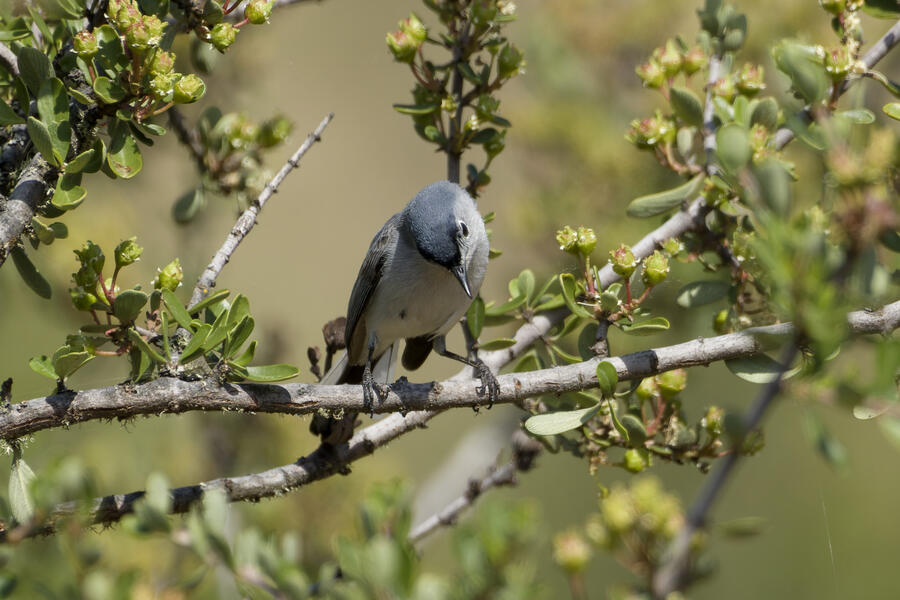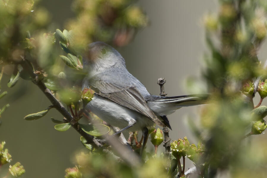 I waited at the location for a few minutes before hearing, barely, a soft Gnatcatcher song or call. A few minutes later a male started singing and flying around from perch to perch. He was easier to spot. I only got around three minutes where I was able to see him and take photos. He was about the size and shape of a Bewick's Wren, but had coloring more like a White-breasted Nuthatch. A very cool bird! I'll have to try to find these birds again next year, a few weeks earlier in the spring, when they're out in the open singing more often.