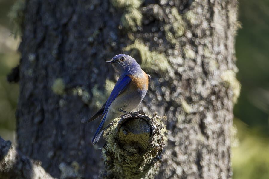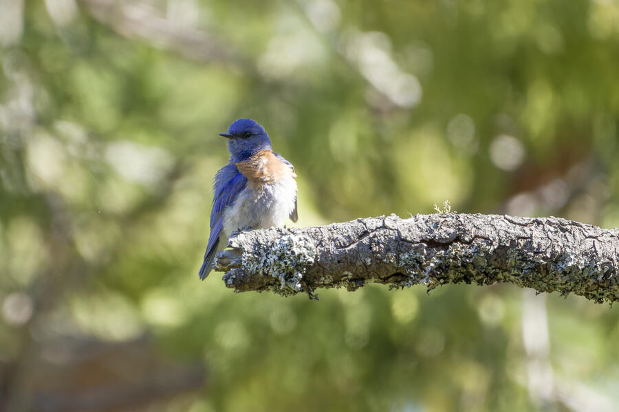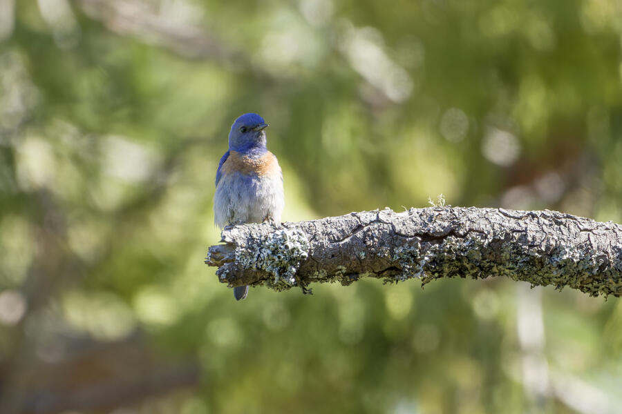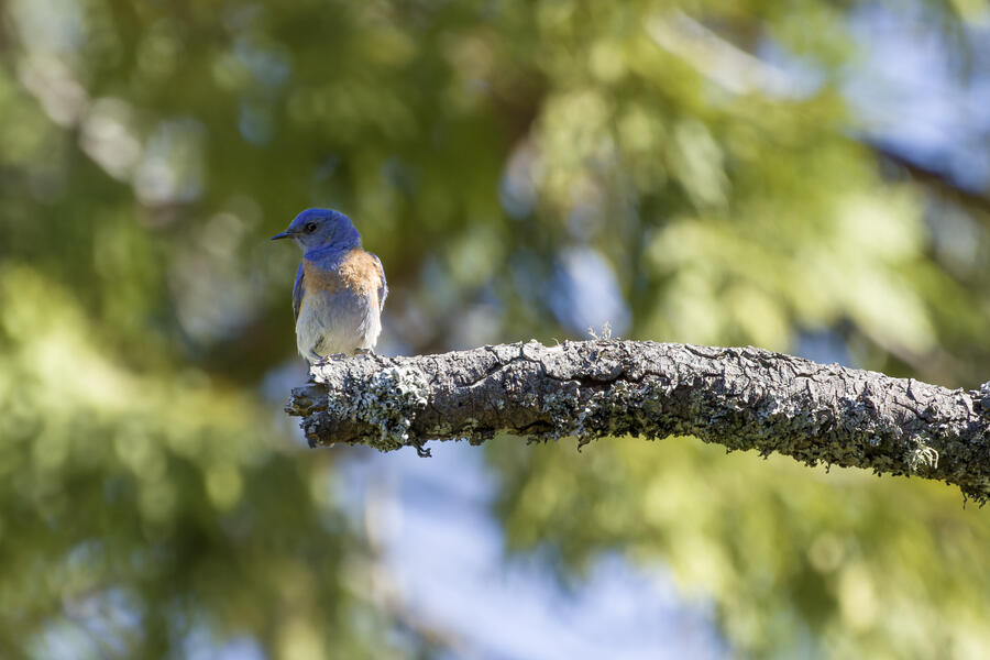I also stopped to watch some Western Bluebirds hunting for insects. I watched one fly to a perch on a tree, look around for a couple minutes, then sally off to catch an insect, and return to another perch. He'd fly well more than 30 or 40 feet either toward another tree, or toward the ground! He repeated this again and again, apparently looking for the movement of distant insects both on tree branches and along the walking path. It was surprising to see how effective a hunter he was, and how far away his prey was!