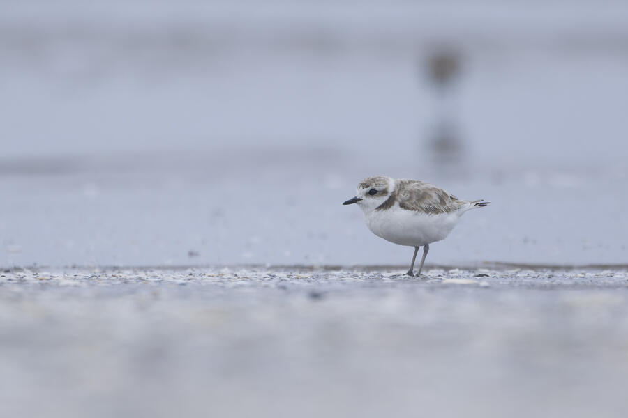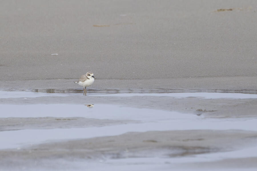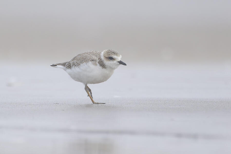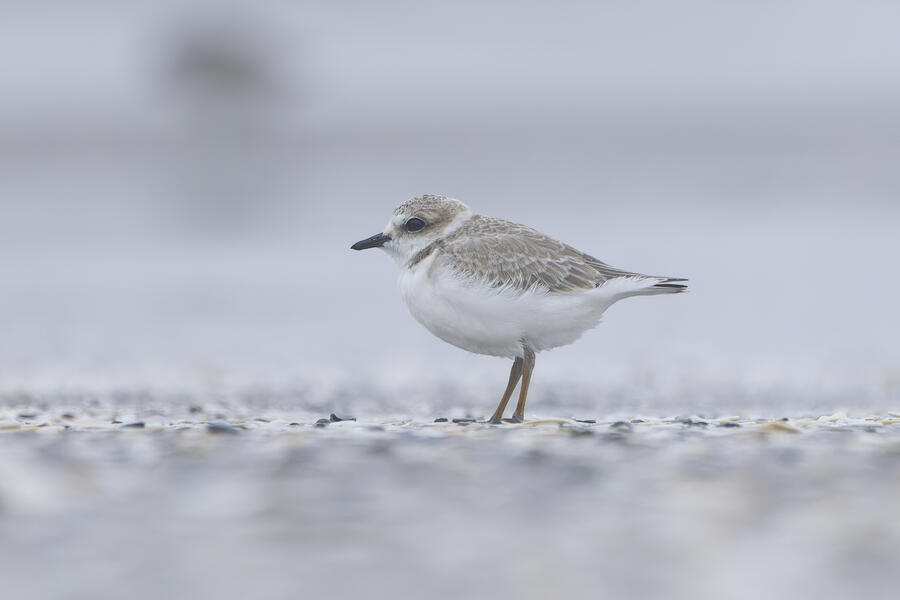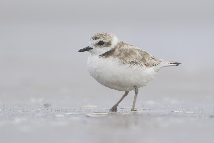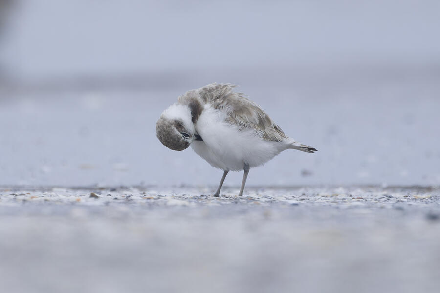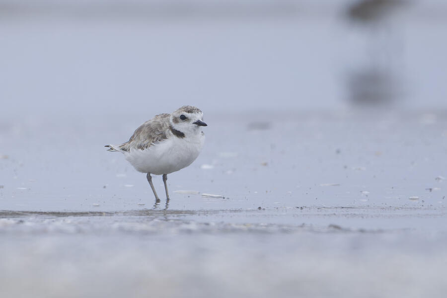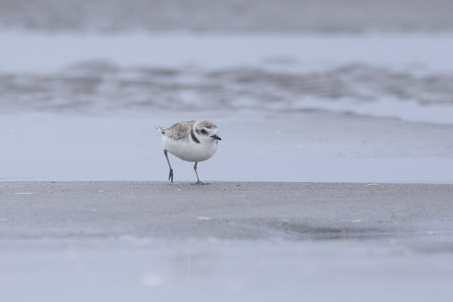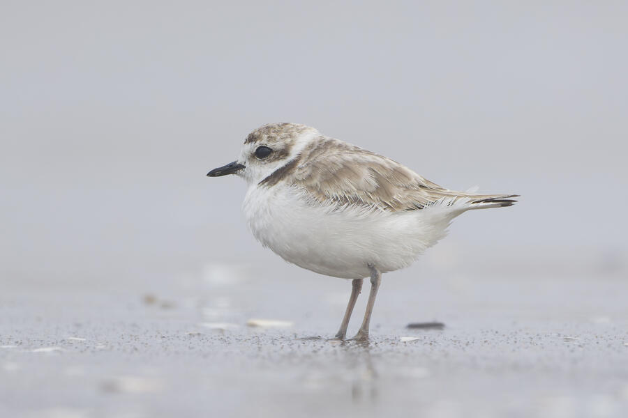 When I pulled into the parking lot around 6:30am it was in the mid-50s and foggy. I walked over the dune separating the parking area from the beach and saw signs and roped-off areas for Snowy Plover nesting. That was a good sign! I quickly saw a small group of peeps gathered around a small tide pool. Right away I saw a few little whiteish birds here and there, and a quick look with binoculars showed them to be Snowy Plovers! It was hard to count them since the were running around a bit and blending into the crowd of Western Sandpipers, but I saw two or three. I put a mat down on the sand to lay on, and a flat dish to stabilize my camera, and I got down on my belly and elbows. I was very lucky — first that the birds were right there next to the parking area, and secondly that as I lay there for an hour or so they sometimes got pretty close. After laying there for a while taking several hundred shots, I walked down the beach for a few minutes. I think I saw 10 total Snowy Plovers, defintely at least 8. They are such charasmatic little birds!