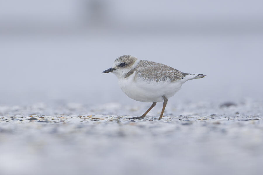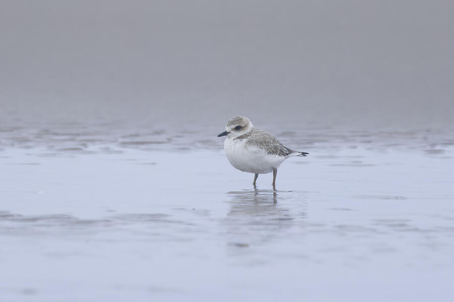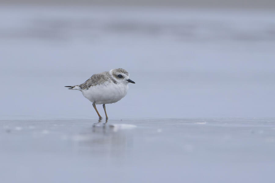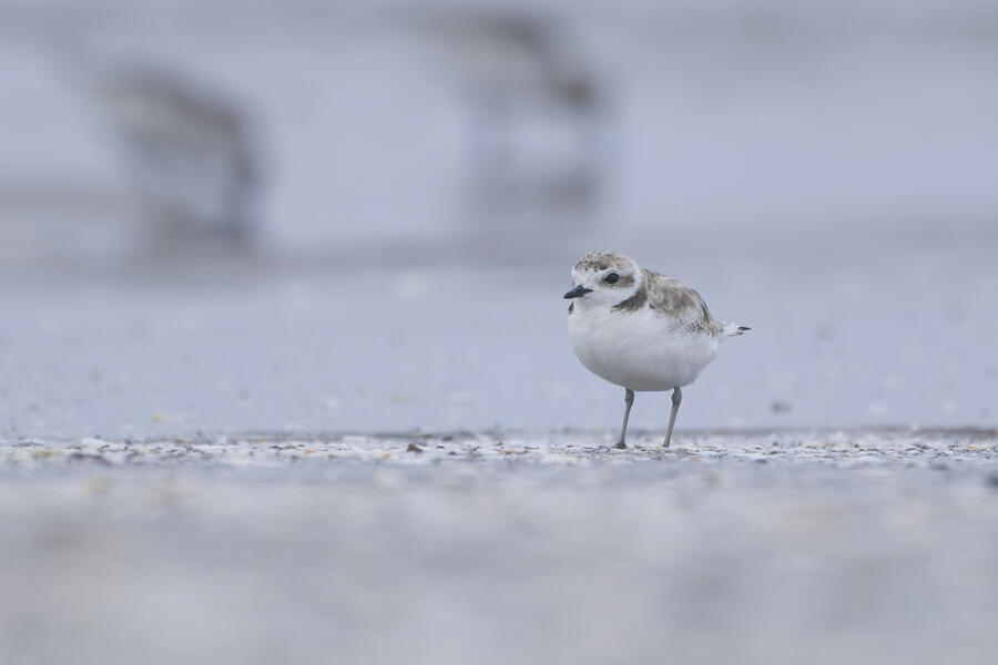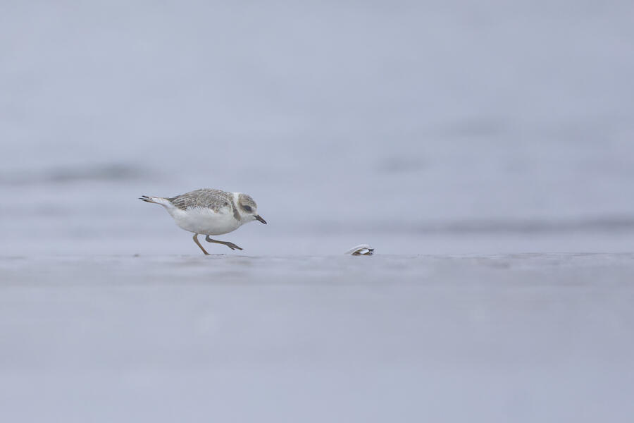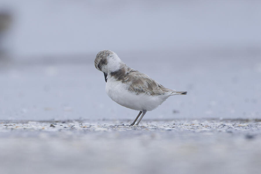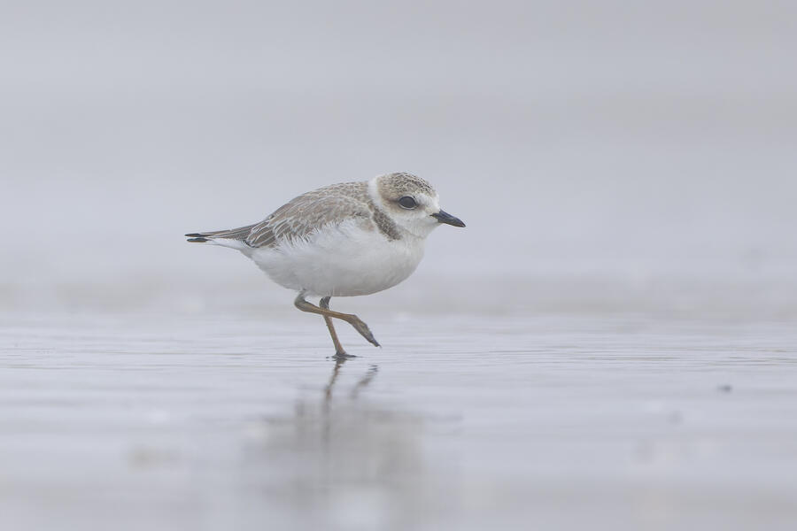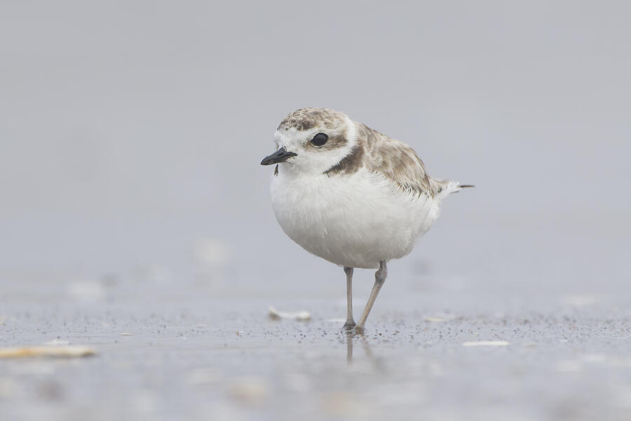 When I pulled into the parking lot around 6:30am it was in the mid-50s and foggy. I walked over the dune separating the parking area from the beach and saw signs and roped-off areas for Snowy Plover nesting. That was a good sign! I quickly saw a small group of peeps gathered around a small tide pool. Right away I saw a few little whiteish birds here and there, and a quick look with binoculars showed them to be Snowy Plovers! It was hard to count them since the were running around a bit and blending into the crowd of Western Sandpipers, but I saw two or three. I put a mat down on the sand to lay on, and a flat dish to stabilize my camera, and I got down on my belly and elbows. I was very lucky — first that the birds were right there next to the parking area, and secondly that as I lay there for an hour or so they sometimes got pretty close. After laying there for a while taking several hundred shots, I walked down the beach for a few minutes. I think I saw 10 total Snowy Plovers, defintely at least 8. They are such charasmatic little birds!
