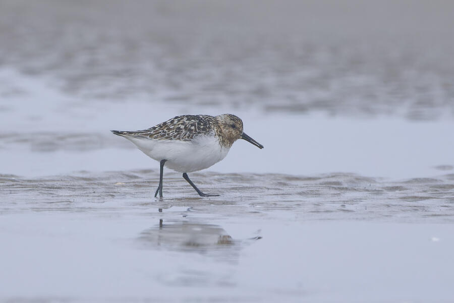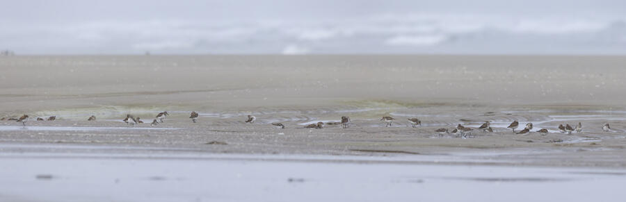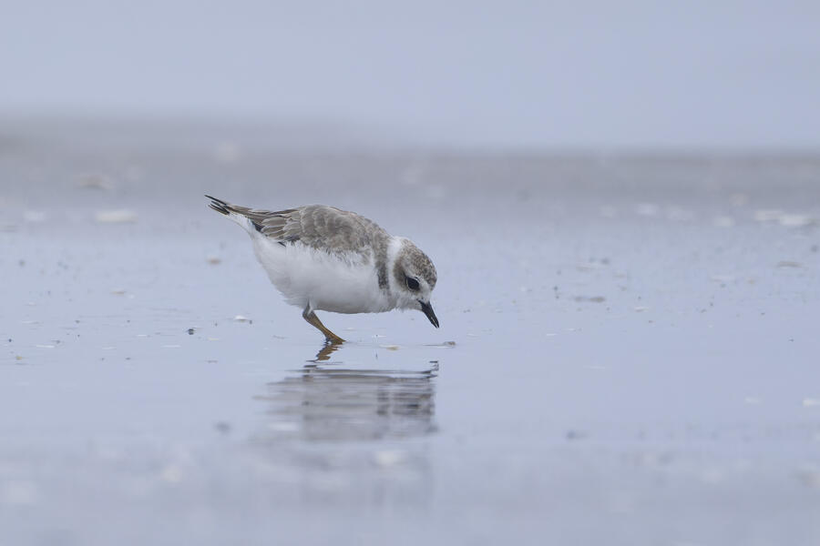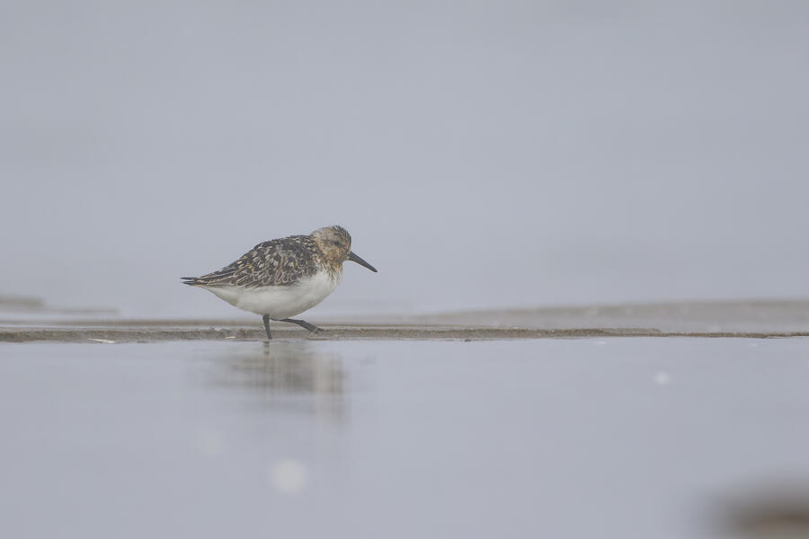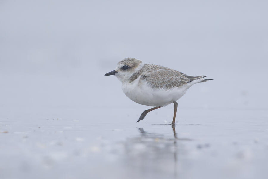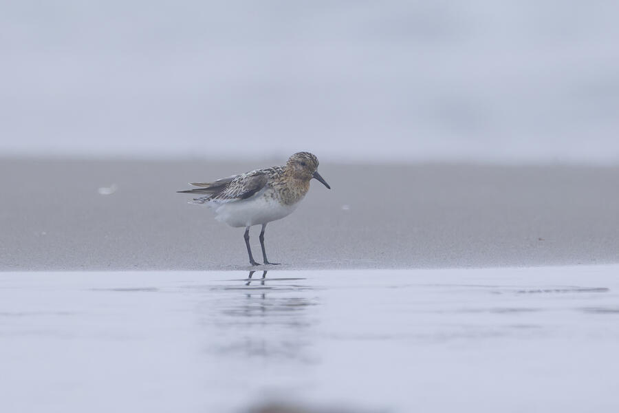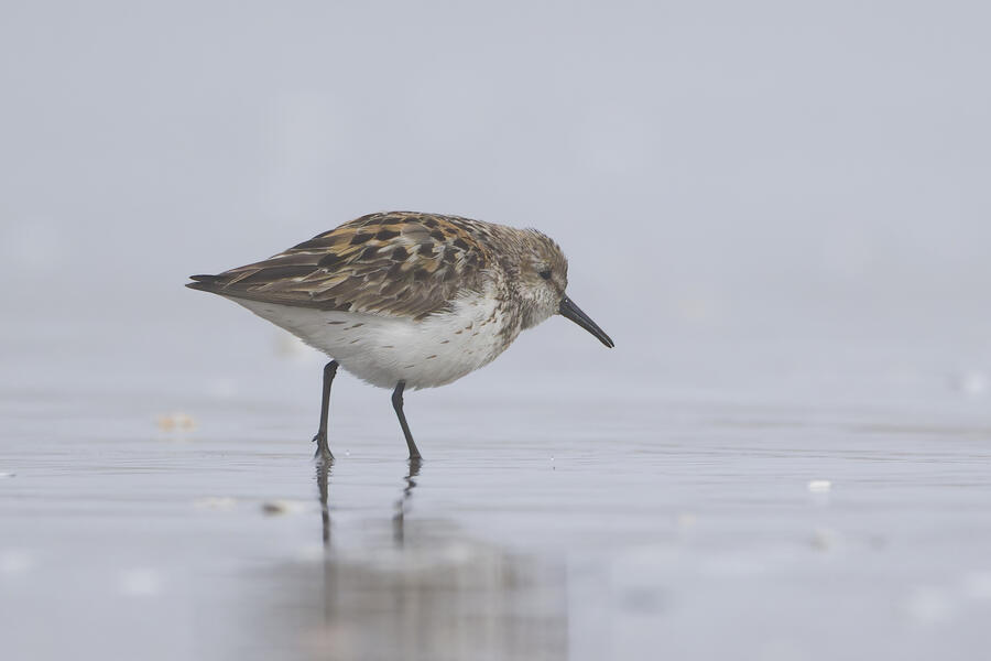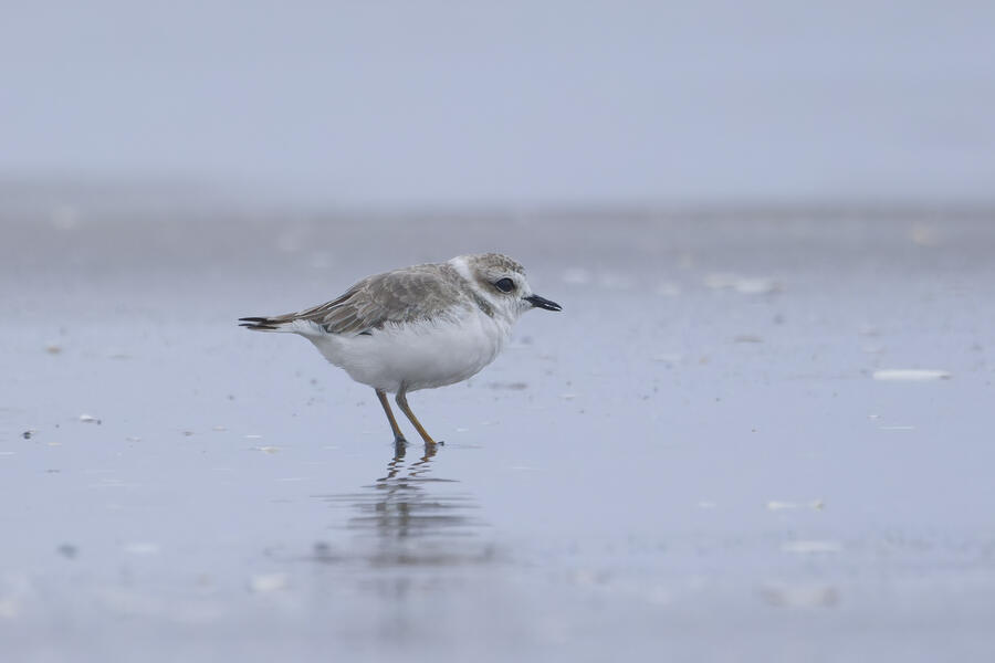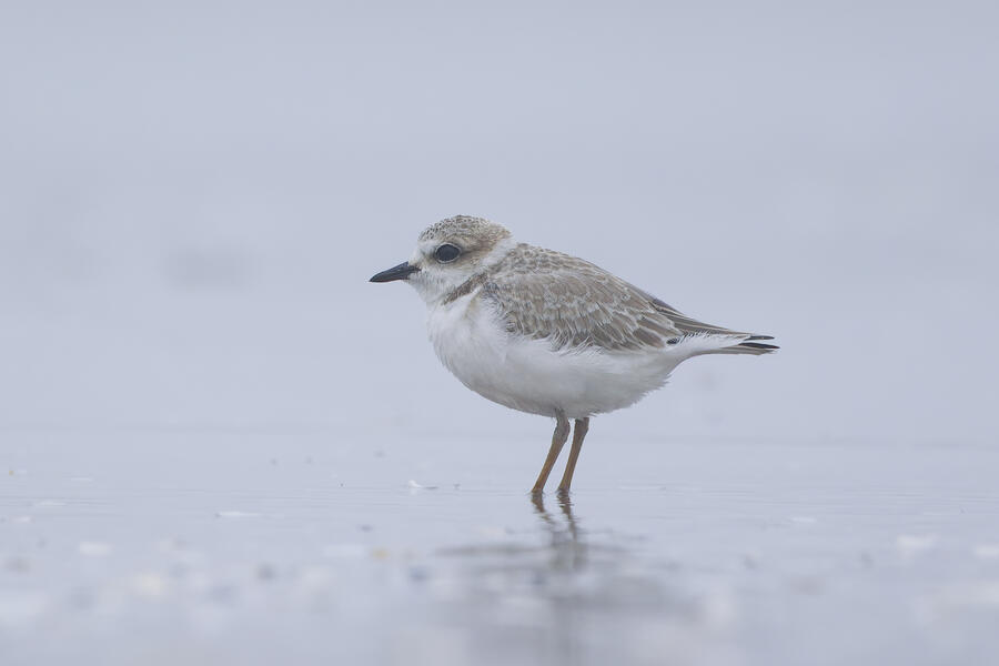 When I pulled into the parking lot around 6:30am it was in the mid-50s and foggy. I walked over the dune separating the parking area from the beach and saw signs and roped-off areas for Snowy Plover nesting. That was a good sign! I quickly saw a small group of peeps gathered around a small tide pool. Right away I saw a few little whiteish birds here and there, and a quick look with binoculars showed them to be Snowy Plovers! It was hard to count them since the were running around a bit and blending into the crowd of Western Sandpipers, but I saw two or three. I put a mat down on the sand to lay on, and a flat dish to stabilize my camera, and I got down on my belly and elbows. I was very lucky — first that the birds were right there next to the parking area, and secondly that as I lay there for an hour or so they sometimes got pretty close. After laying there for a while taking several hundred shots, I walked down the beach for a few minutes. I think I saw 10 total Snowy Plovers, defintely at least 8. They are such charasmatic little birds!