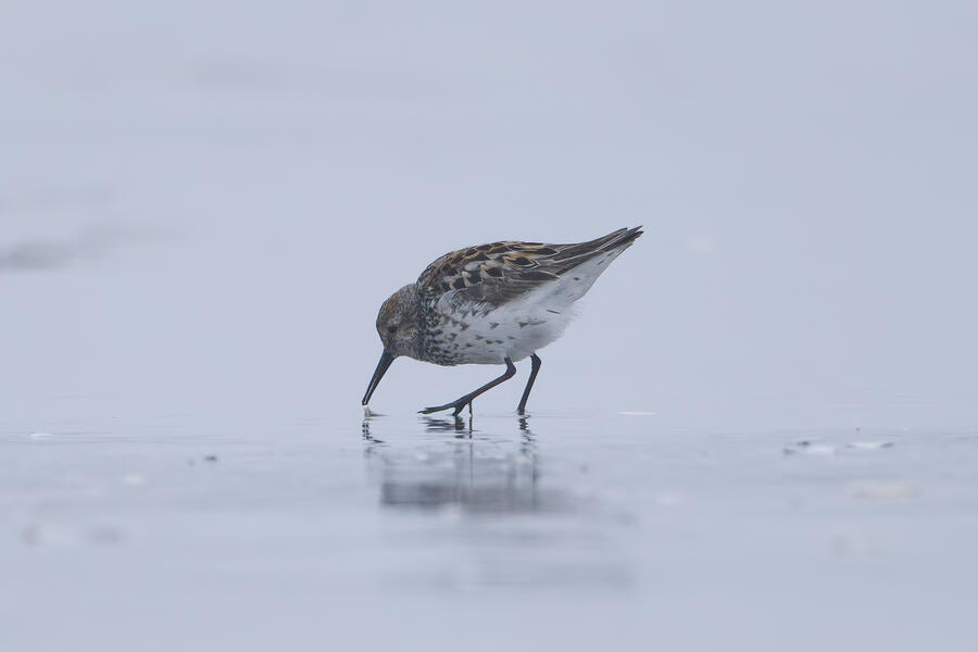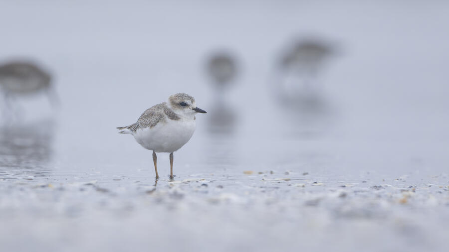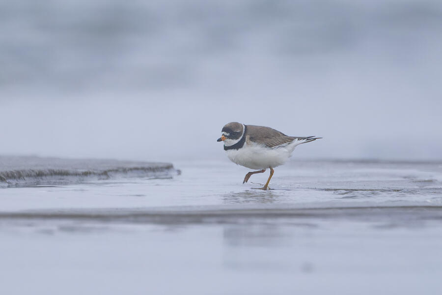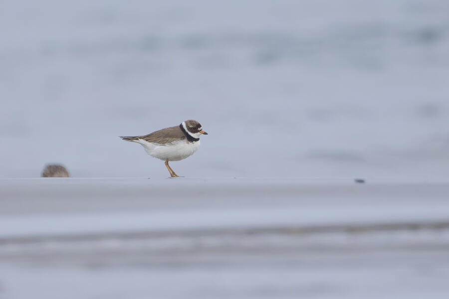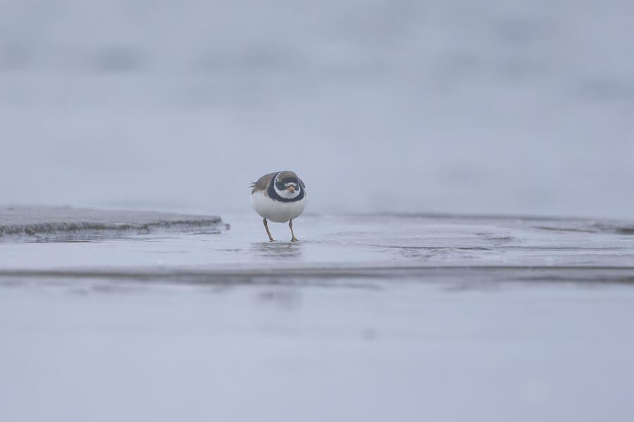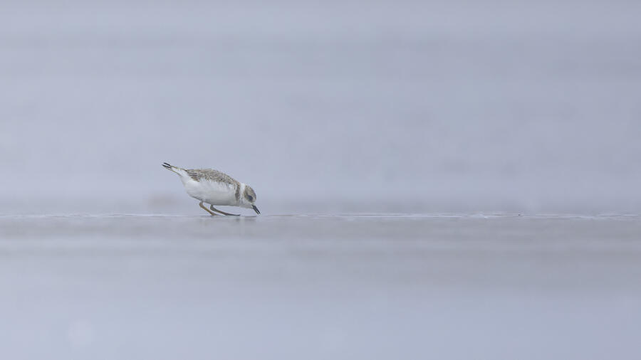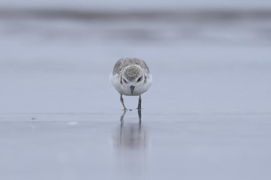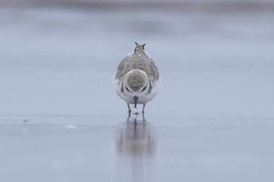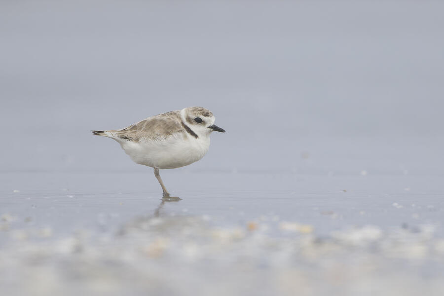 When I pulled into the parking lot around 6:30am it was in the mid-50s and foggy. I walked over the dune separating the parking area from the beach and saw signs and roped-off areas for Snowy Plover nesting. That was a good sign! I quickly saw a small group of peeps gathered around a small tide pool. Right away I saw a few little whiteish birds here and there, and a quick look with binoculars showed them to be Snowy Plovers! It was hard to count them since the were running around a bit and blending into the crowd of Western Sandpipers, but I saw two or three. I put a mat down on the sand to lay on, and a flat dish to stabilize my camera, and I got down on my belly and elbows. I was very lucky — first that the birds were right there next to the parking area, and secondly that as I lay there for an hour or so they sometimes got pretty close. After laying there for a while taking several hundred shots, I walked down the beach for a few minutes. I think I saw 10 total Snowy Plovers, defintely at least 8. They are such charasmatic little birds!