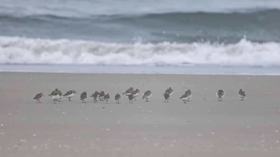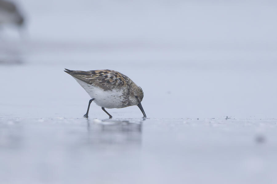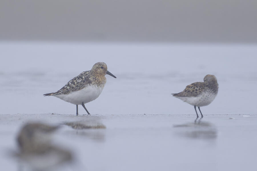 The Sanderlings were maybe 50% larger than the Western Sandpipers. I took a bunch of shots of them to help confirm the ID, and when I got home I learned that they lack the hind toe that other peeps have, and some of my photos clearly showed this field mark. As I processed the photos over the last few days I became able to recognize them at a glance: their heads are relatively small compared to Western Sandpipers'.