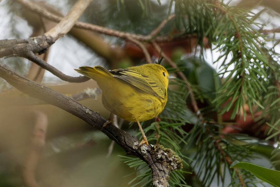 Yellow WarblerThis bird is yellow and without many other field marks. That I think indicates Yellow Warbler. I looked at photos of Orange-crowned Warbler as well, but those don't have the yellow color extending all the way to the tip of the under tail like this bird does, and the bill doesn't quite look pointy enough. I am pretty confident this is a Yellow Warbler.
