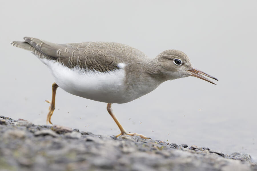 Spotted SandpiperI've photographed a Spotted Sandpiper at this exact location before. I was out of position this time, and I couldn't move or else I'd scare it off. It was moving along the water's edge, toward me, so I crouched down and waited: there was a small gap between some bushes where it would be visible unobstructed, so I had to be ready to hit the shutter at the right instant. It was moving pretty quickly as it scampered along. I was able to focus and fire off only three exposures while it was between the bushes. Luckily this exposure was in focus, and with good eye contact!