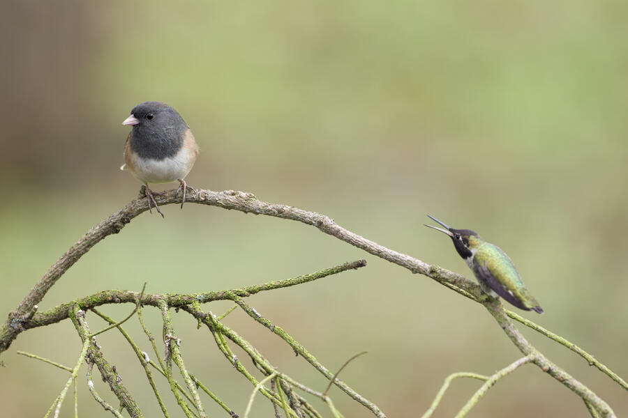 At home, I was trying to photograph a Dark-eyed Junco when an irate Anna's Hummingbird flew in to reclaim a stick near the feeder. The Junco flew off after just a few moments of hummingbird screeching.