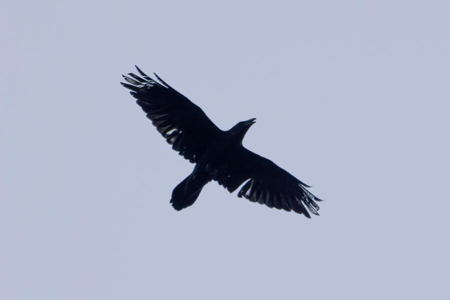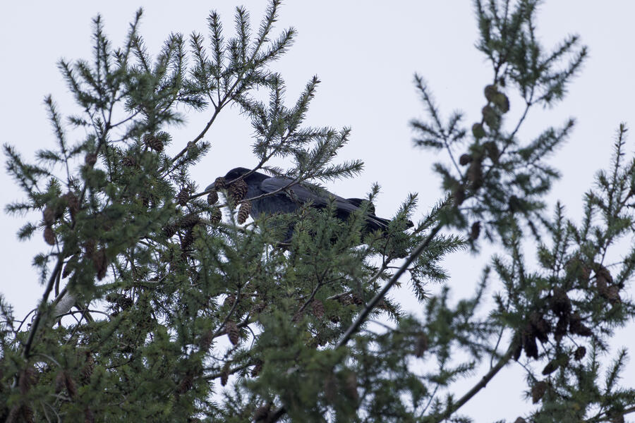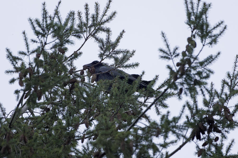 I also added another bird to the yard photos list: Common Raven. I've heard them well overhead a few times from the yard lately, but this time one spent a while squawking from the top of a tree and I was able to photograph it.