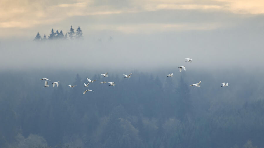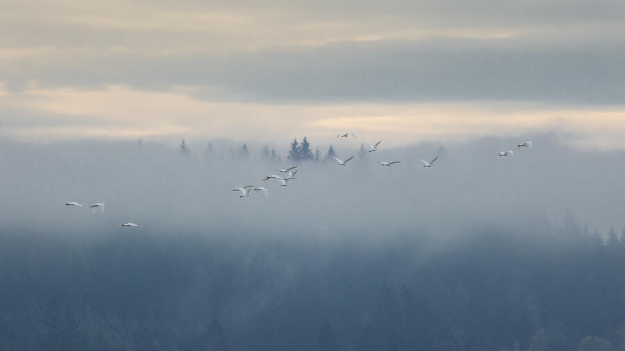 I made a quick trip out to the wetlands. There was some nice light and mist, and I was able to get some landscape shots and panoramas. I was lucky enough to spot a group of large white birds take off in the distance, and get my camera ready fast enough to capture them with a nice backdrop. They turned out to be Great Egrets with a Snowy Egret among them! Based on recent sightings in the area I'm pretty sure it's the same individual Snowy Egret I saw here in December.