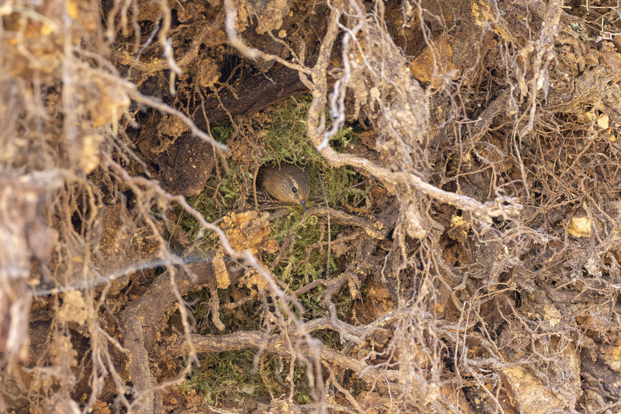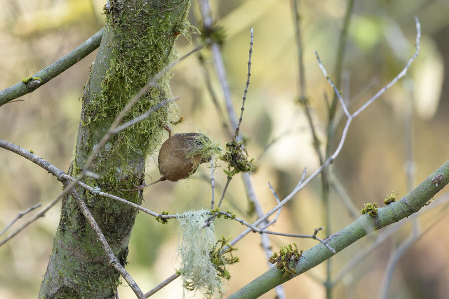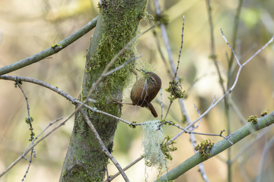 Pacific WrenAccording to Cornell Lab's Birds of the World, males build nests but females often help line the nests before laying eggs. It was unclear whether the nesting material being gathered here was for building or lining, so it's unclear whether I was watching a male or female.