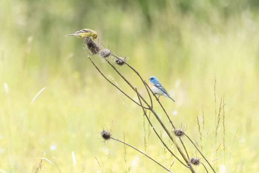 Lazuli Bunting, American GoldfinchThe American Goldfinch was in a better pose here so I left it in.