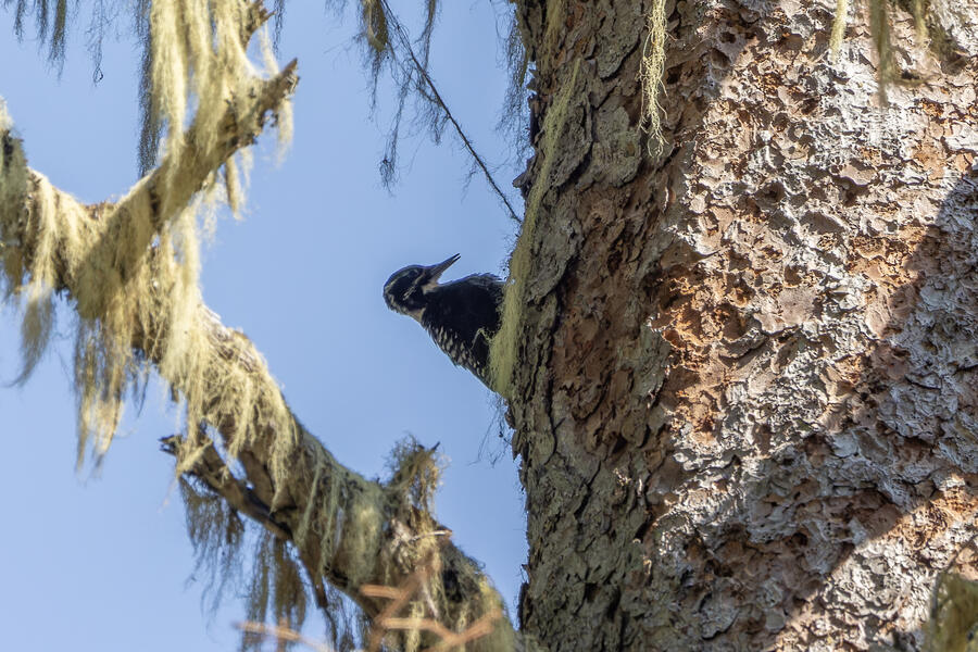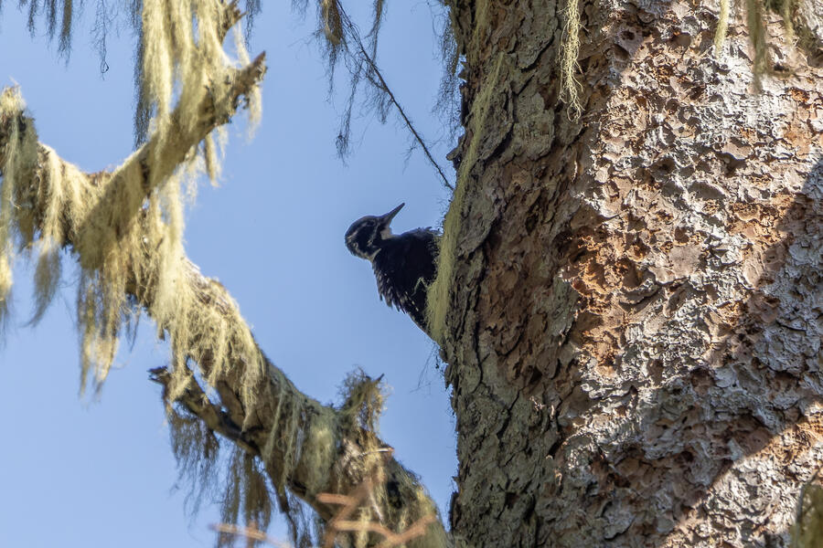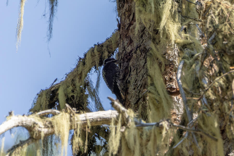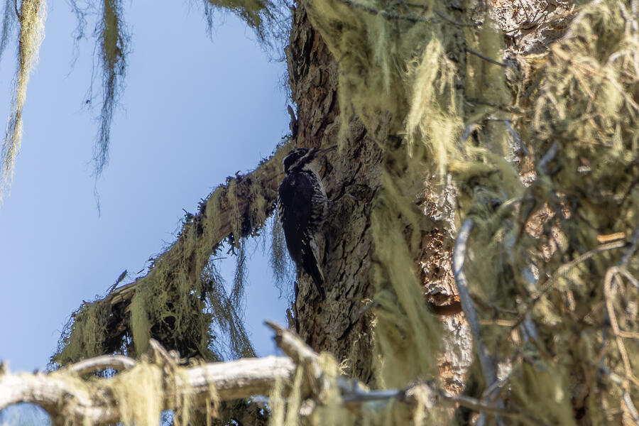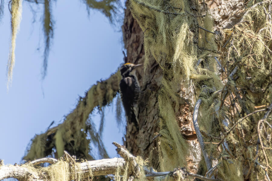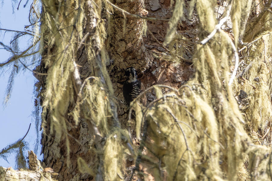 Farther down the trail, I had again stopped to listen and heard very faint woodpecker drumming noises. I found the tree where the sound seemed to be coming from, but couldn't see it. As I waited there for a few minutes, I saw pieces of bark falling — but still couldn't see it. I walked up and down the path a little to try to peer around to different sides of the tree, but had no luck. Finally, a little dark woodpecker climbed up into view. The light wasn't great, so even with my binoculars and scope I couldn't tell exactly what I was looking at. The photos show clear white barring on the back and a yellow cap: American Three-toed Woodpecker!