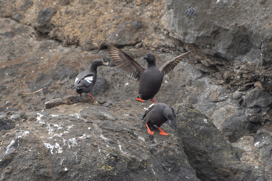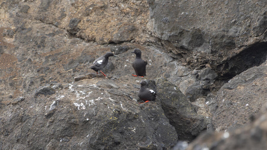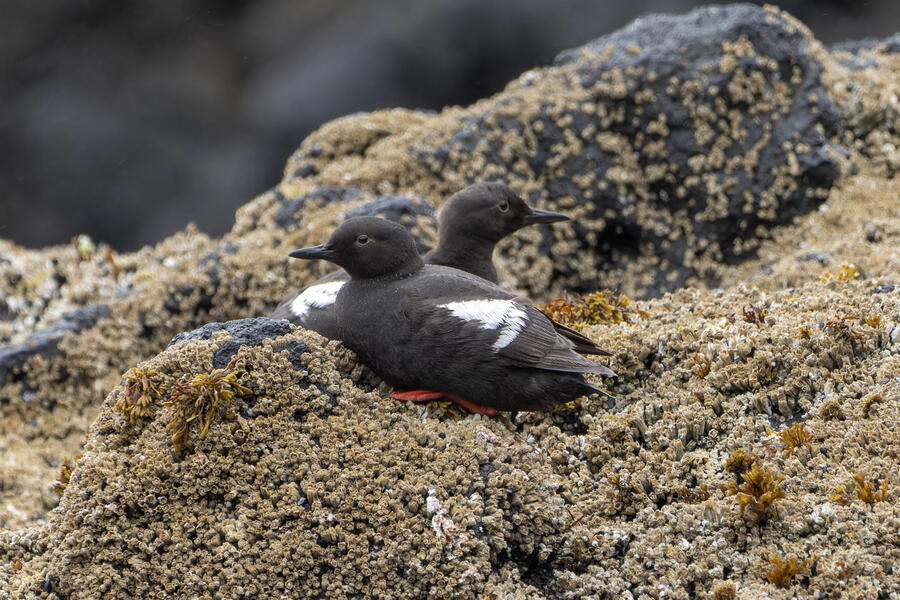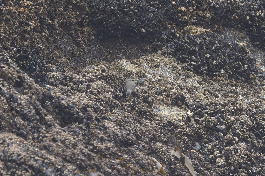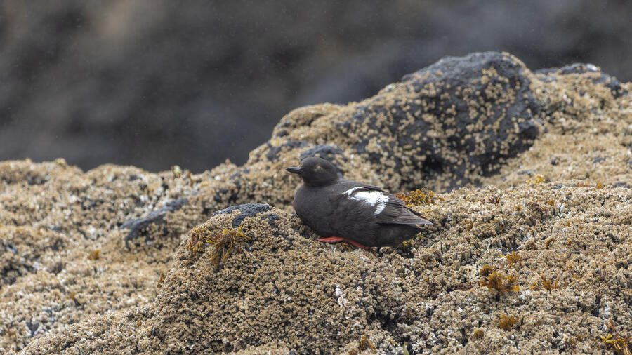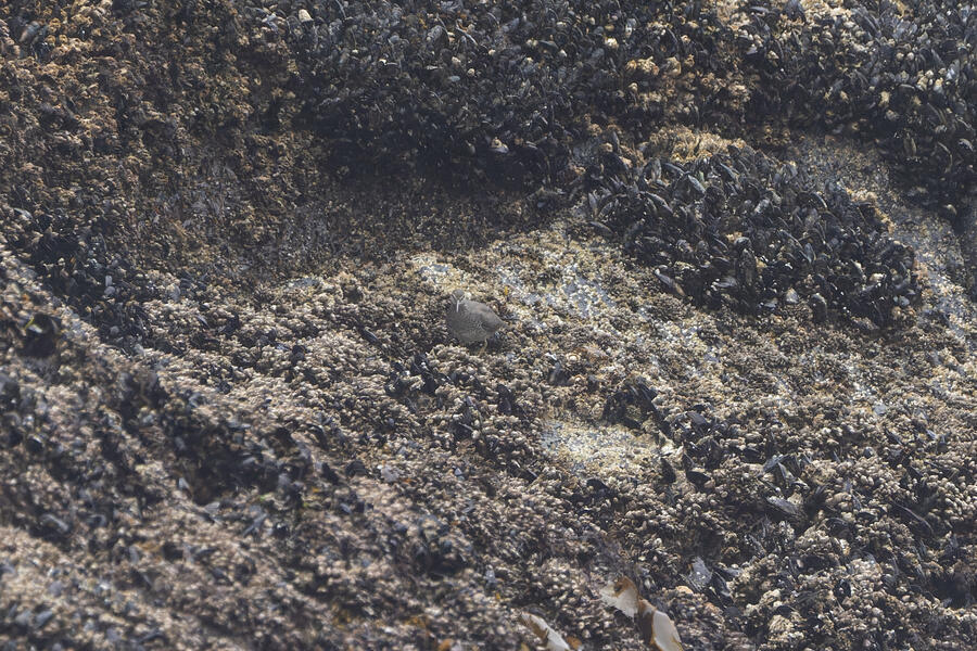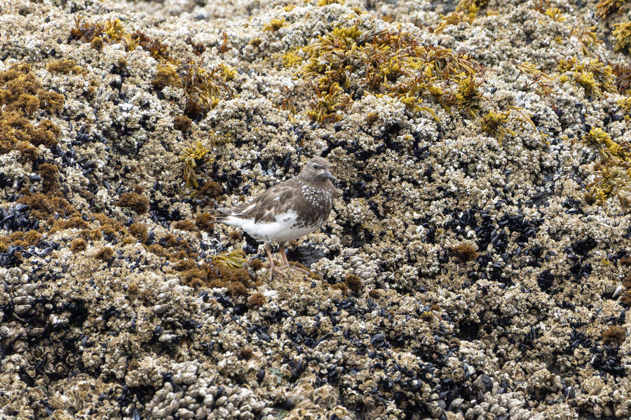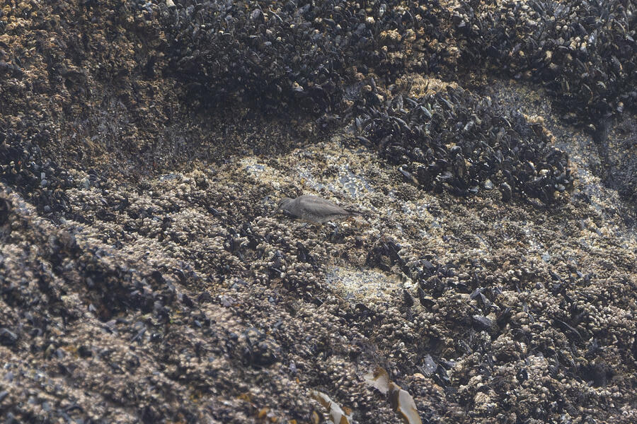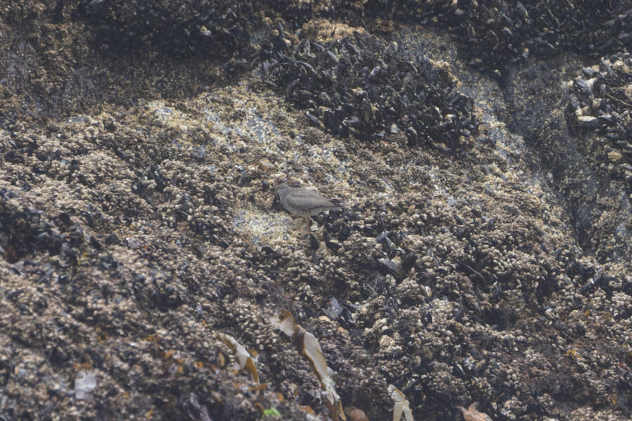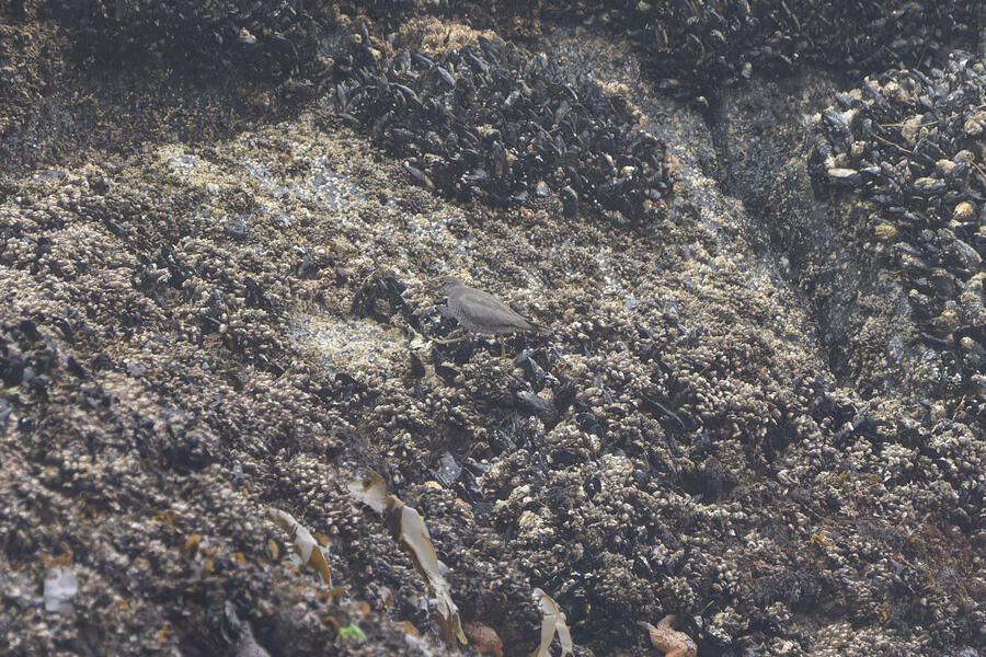 Due to favorable weather conditions, I drove to the coast on the next day. The tops of some huge towering sea stacks held a few hundred Murres, Gulls, and Cormorants. Down below, there were some birds down closer to eye level too. I walked along the beach right up to the rocks. There were plenty of other people around (there always are) so I wasn't intruding upon the birds. The longer I stood there, with the waves running up to reach my boots, the more birds I saw. Some Pigeon Guillemot were resting on the rocks, and I took the opportunity to get my best-ever shots of them. A Black Oystercatcher was breifly visible. I noticed a smaller bird blending right into the rocks in front of me: Black Turnstone. After enjoying the atmosphere for a while, I was about to turn around and leave when I saw another pair of brownish wings flutter against the rocks. I thought it was probably another Black Turnstone but when I looked with my bincoulars it appeared to be a lifer Wandering Tattler! It was a bit far away, and hard to see, but I recognized its shape. The photos I got aren't great (better than I expected) but plenty good to confirm my sighting.
