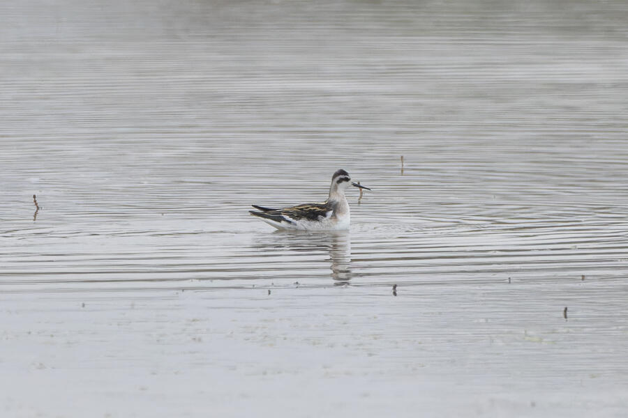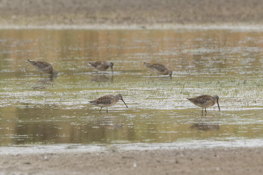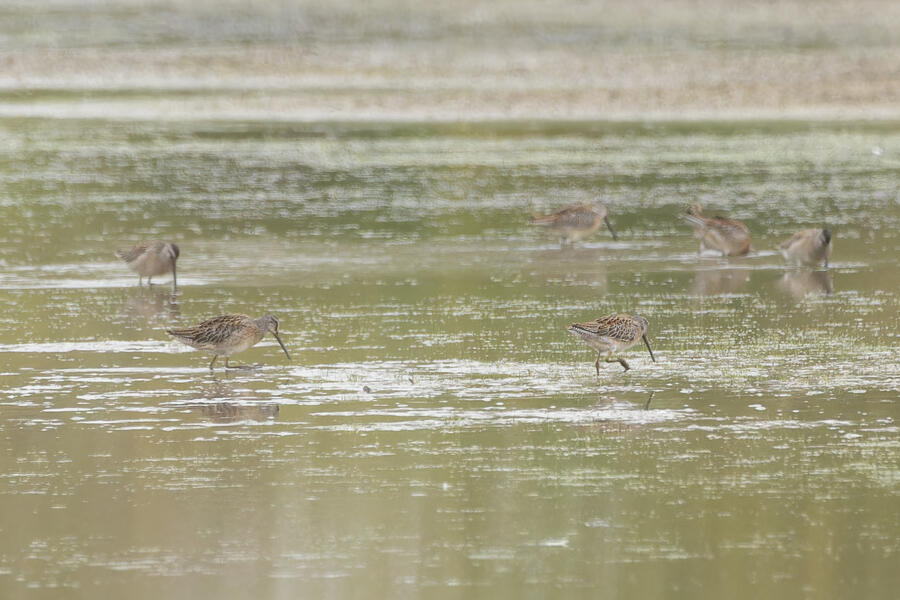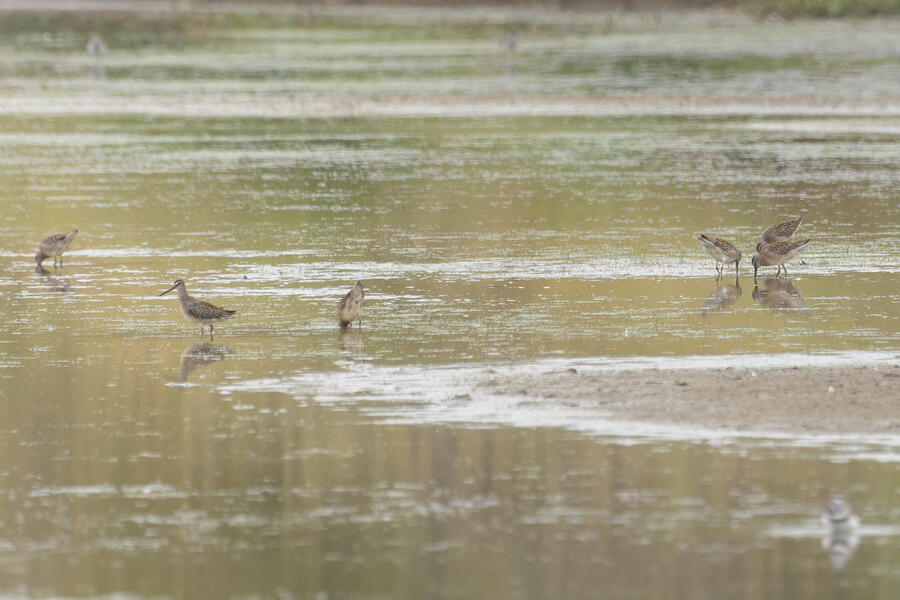 Next, after several tries over the last few years I finally was convinced I saw my lifer Short-billed Dowitchers. I knew that juveniles are pretty much the only ones that can be easily distinguished visually from Long-billed's, and I knew that juveniles are known to move through this area at this time of year. I saw what looked through the scope like a bunch of juvenile Short-billed with their orange-outlined tertial feathers with the telltale orange central stripe down the middle. They were pretty far away, unfortunately, and in the photos only a few of them have the clear orange central stripe on the tertials. Though I hoped for better photos, I'm glad I finally found a small group of Short-billed's.