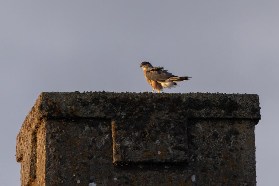 Thousands of Vaux's Swifts gather to roost in a local chimney every evening at dusk. I'm not sure whether this happens all summer or just in the fall. I don't know how I hadn't gone out to watch this before, but it was fun! It began a bit ominously because a Cooper's Hawk was already in position on the chimney when we arrived. After more than a half hour of a growing number of swifts circling overhead, it finally caught one and flew off. Once this daily sacrifice was complete, the mood lifted. A few minutes later the swifts began to swirl and pour into the chimney.