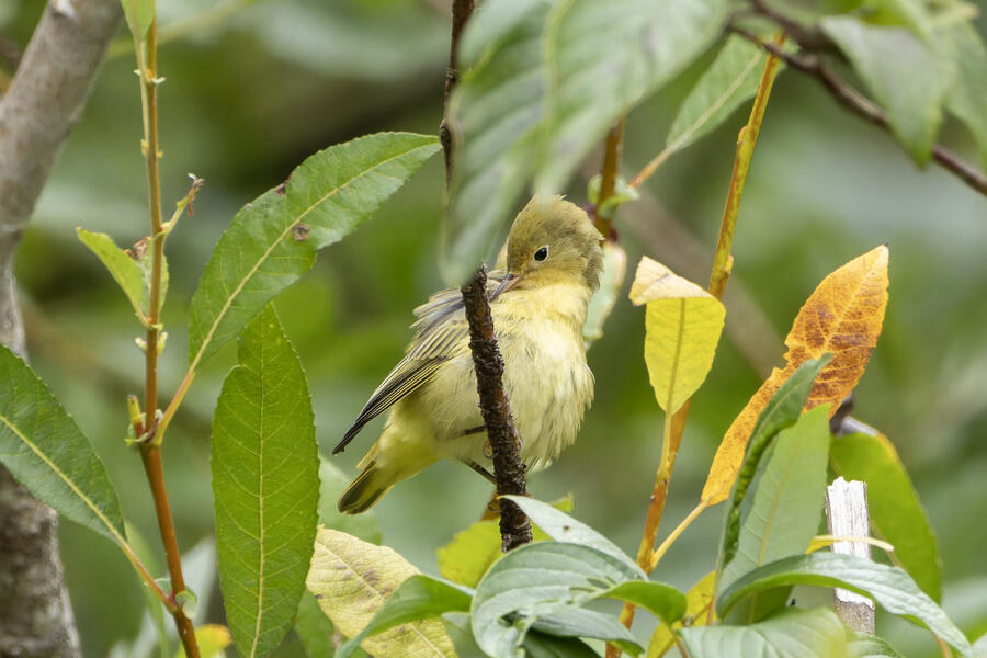 Yellow WarblerThis fall warbler was a bit cryptic for me. I was debating between Wilson's and Yellow, but for a Wilson's, the head seems too elongated, the bill isn't exactly right, the eye ring too pronounced, the tail too short, and not enough of a green wash to the back.