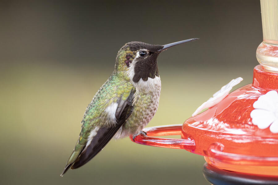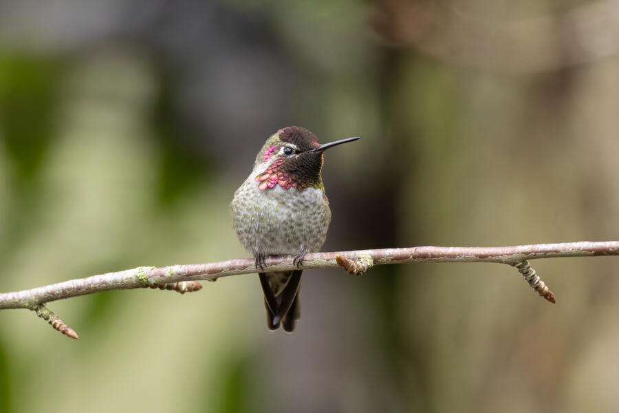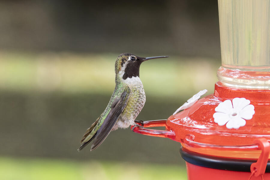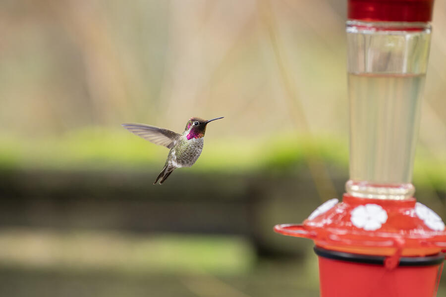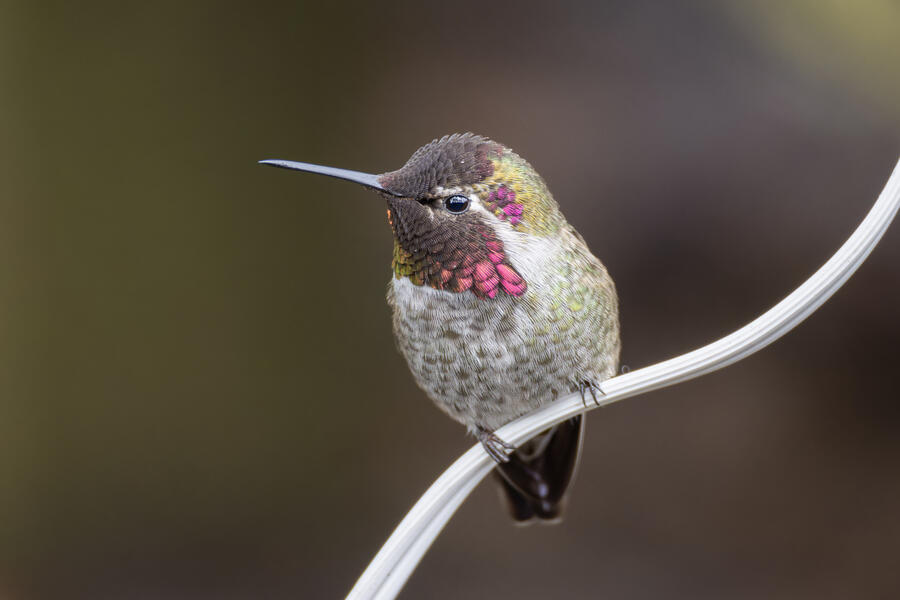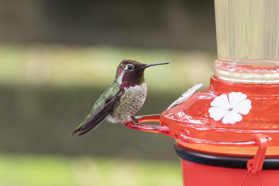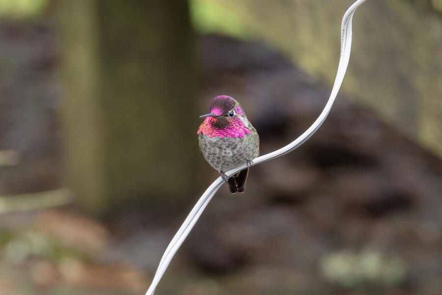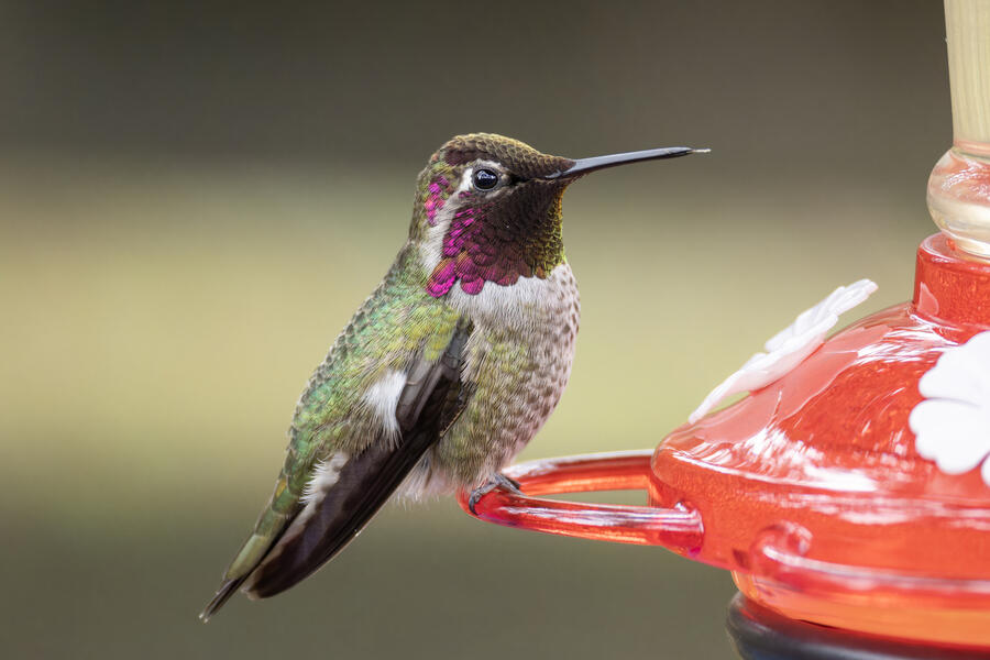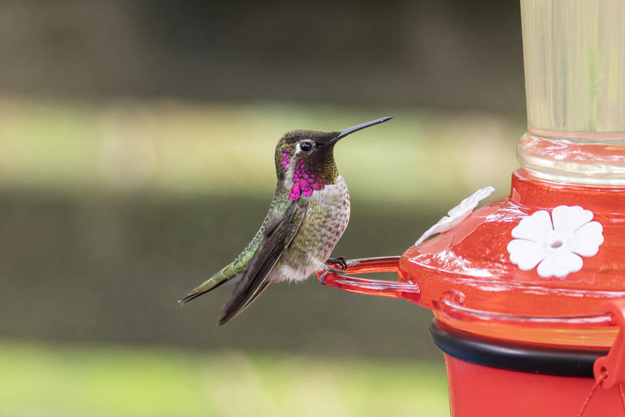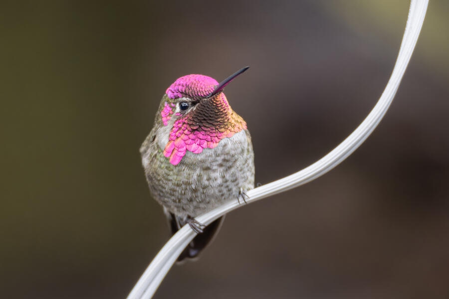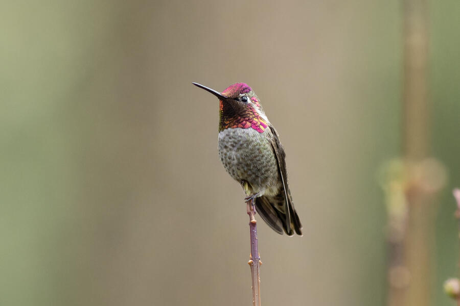 A male Anna's Hummingbird has been consistently appearing at the feeder for the last few weeks. I was able to get pretty close to the shots I wanted after waiting for a while near the feeder. I used my reglar f/9 zoom lens, but it was kind of a dark afternoon. I also experimented with a 200m f/2.8 lens since I was able to get pretty close without bothering him. The faster aperture definitely allowed for a lower ISO: the shots of him hovering near the feeder were shot at ISO 4000 with the zoom lens (at f/6.3) and ISO 2000 with the prime lens (at f/3.2). While waiting for him to fly down to drink or perch I was surprised to see a second male Anna's appear and get chased away. Because they appear to have different preferred perches, and I'd been seeing them on both, I guess I had been seeing two separate individuals at the feeder.