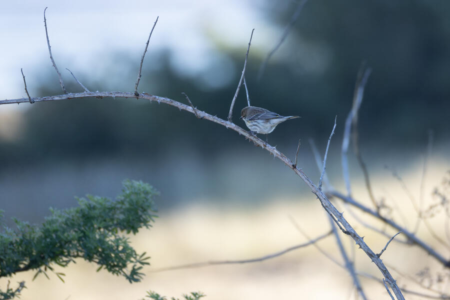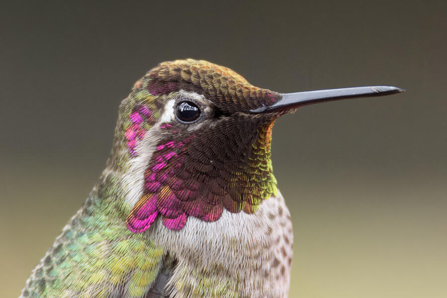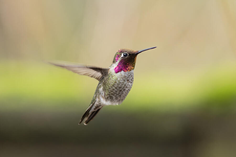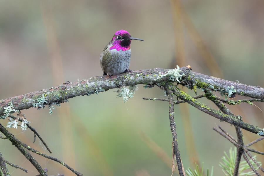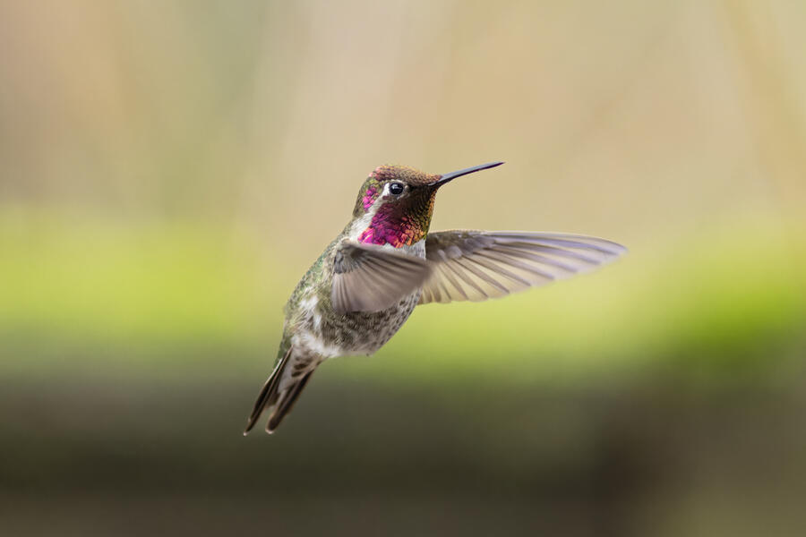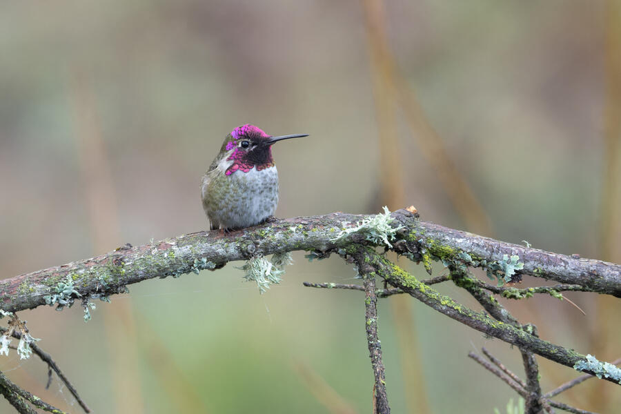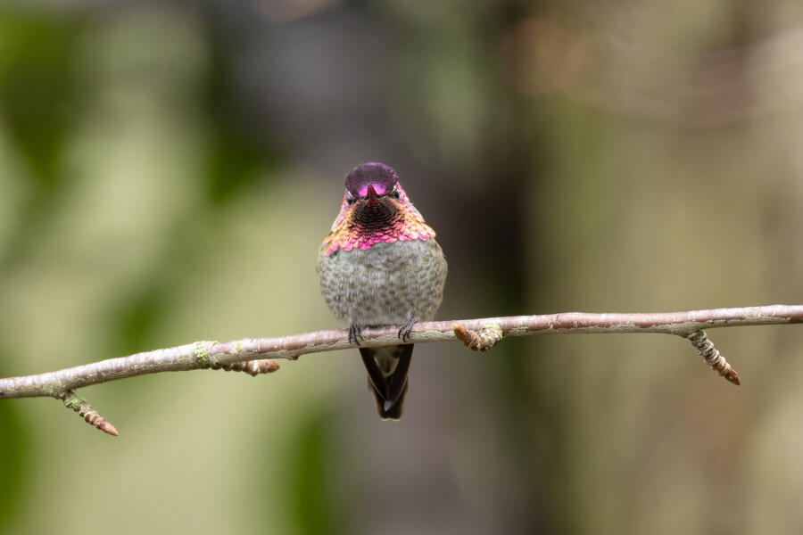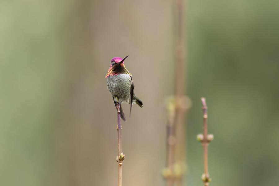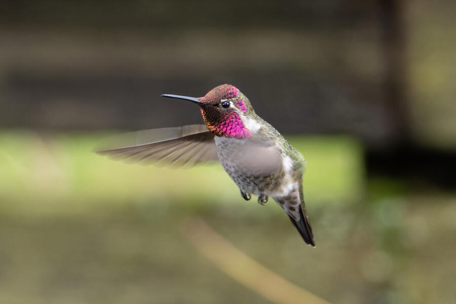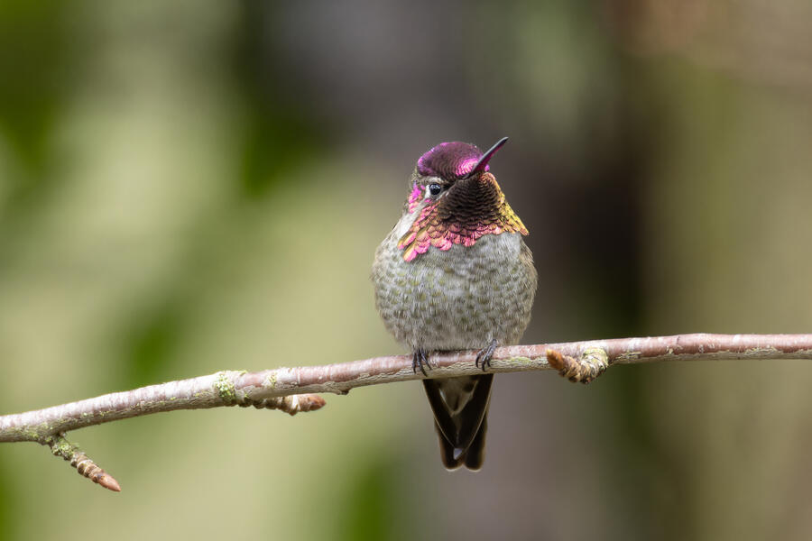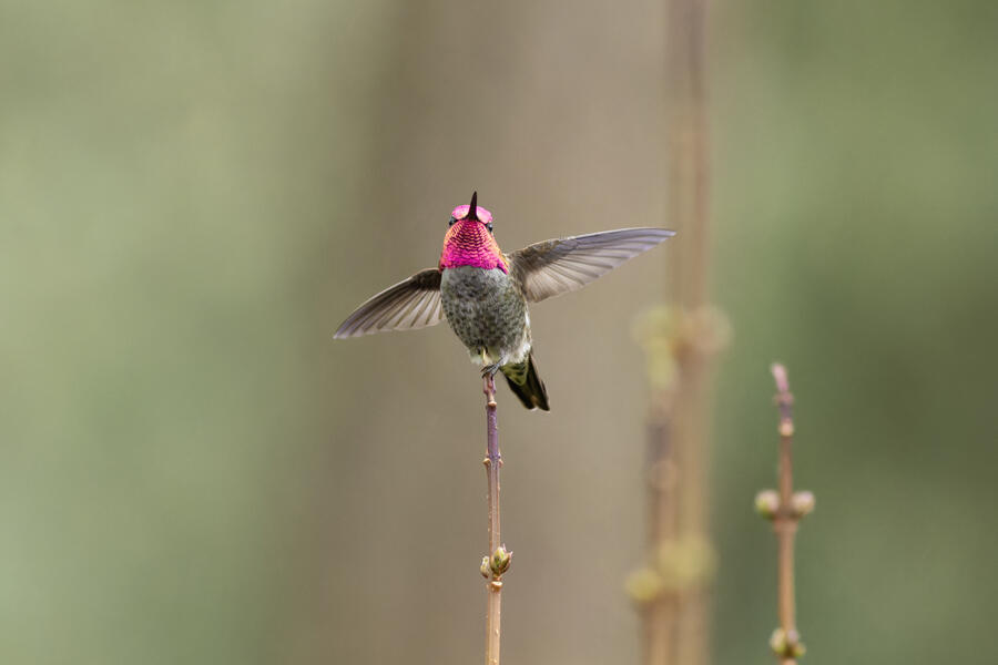 A male Anna's Hummingbird has been consistently appearing at the feeder for the last few weeks. I was able to get pretty close to the shots I wanted after waiting for a while near the feeder. I used my reglar f/9 zoom lens, but it was kind of a dark afternoon. I also experimented with a 200m f/2.8 lens since I was able to get pretty close without bothering him. The faster aperture definitely allowed for a lower ISO: the shots of him hovering near the feeder were shot at ISO 4000 with the zoom lens (at f/6.3) and ISO 2000 with the prime lens (at f/3.2). While waiting for him to fly down to drink or perch I was surprised to see a second male Anna's appear and get chased away. Because they appear to have different preferred perches, and I'd been seeing them on both, I guess I had been seeing two separate individuals at the feeder.