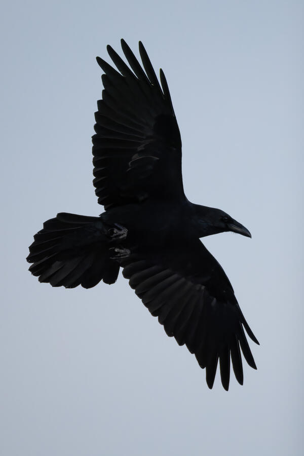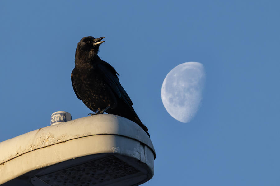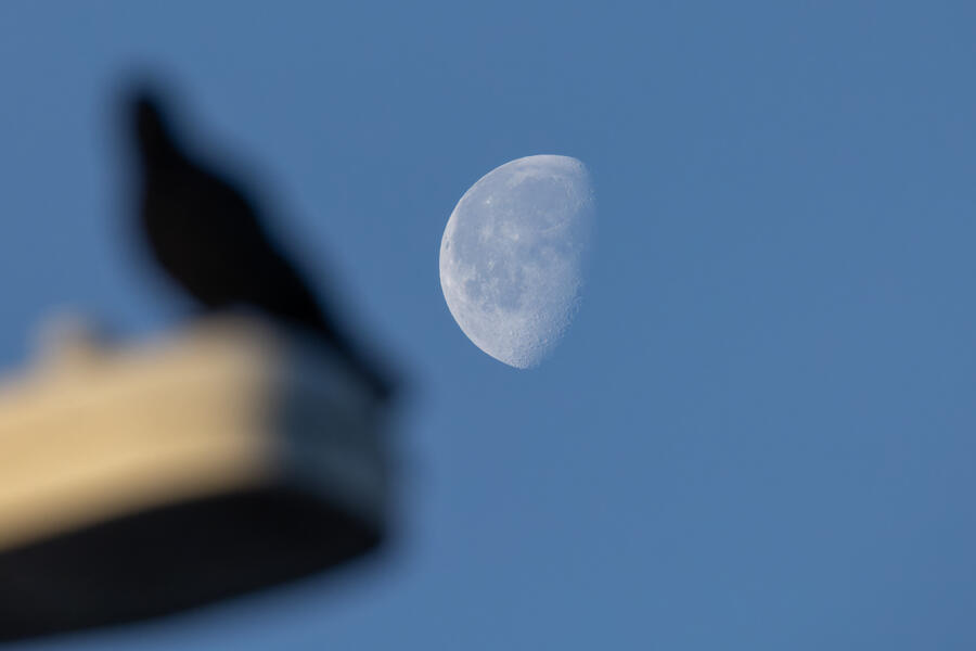 This is a Photoshop composite of the two following frames, one with a sharp crow and one with a sharp Moon. I shot the crow at f/14 but the Moon was still quite soft. I gave the Moon a little blur in the composite to make it seem a little less artificial.