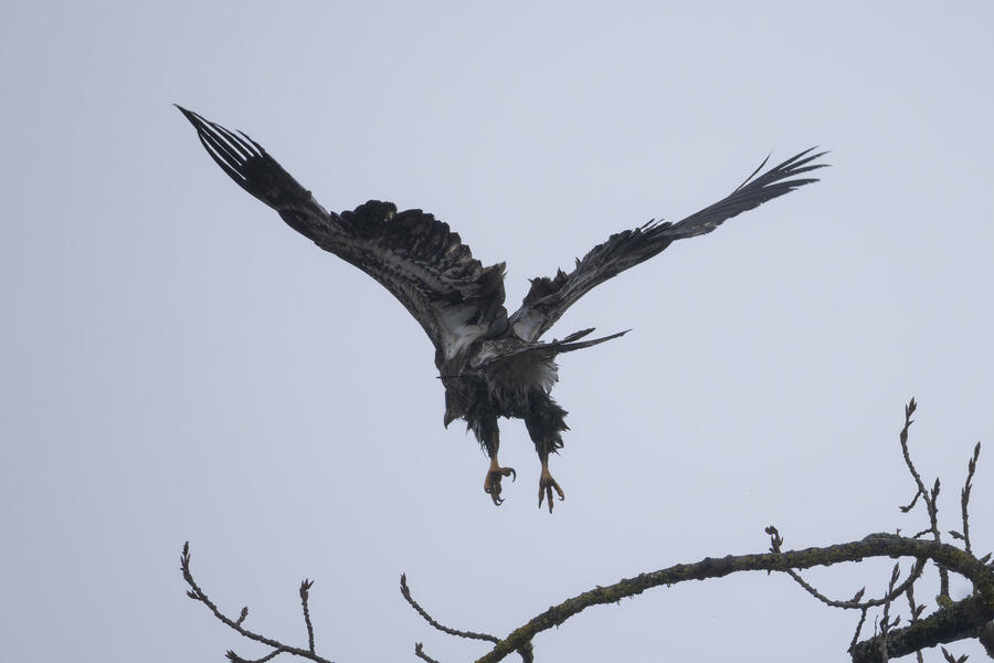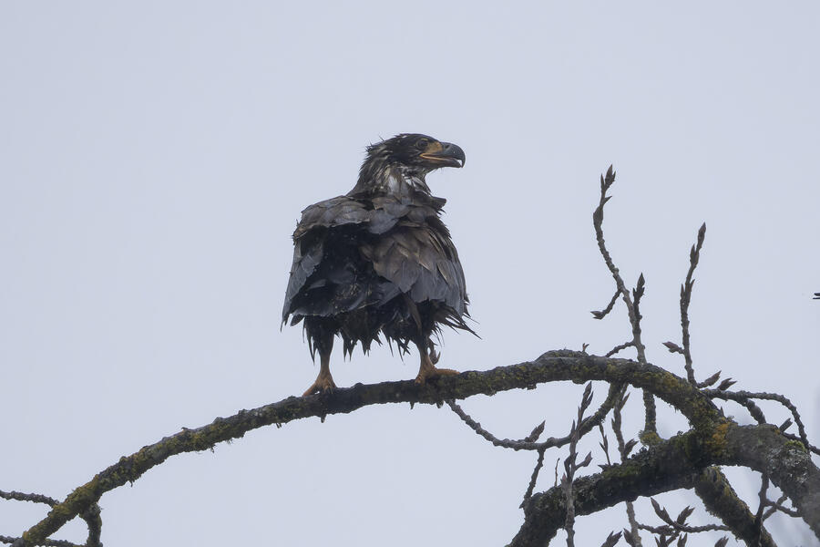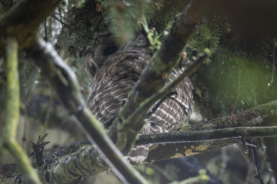A local birder told me the location of a Barred Owl, so I went out in the rain to try to find it. Even when knowing where it was, it would be easy to overlook. After finding the owl, I used silent shooting mode on my mirrorless camera and took only a few shots before stepping away. I was looking up at the owl from underneath, so it wasn't worth waiting for a good shot anyway. I spent a few minutes after that trying to get a view of it, and perhaps its face, from farther away. After walking all around the tree and lots of scanning with binoculars I wasn't able to get a view of it. I wonder how many owls I've walked right by without knowing.