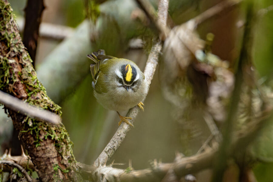 Golden-crowned KingletI spent a few minutes trying to photograph some eye-level Golden-crowned Kinglets. I didn't have much luck. These two photos were the best but there was some vegetation in the way in the foregound, causing a large area of the photos (including the bird) to be a bit soft and green-tinted. I was able to fit them somewhat with dehaze, tint, and temperature adjustments in Lightroom Classic. I'll keep trying for a clear eye-level picture of these guys!