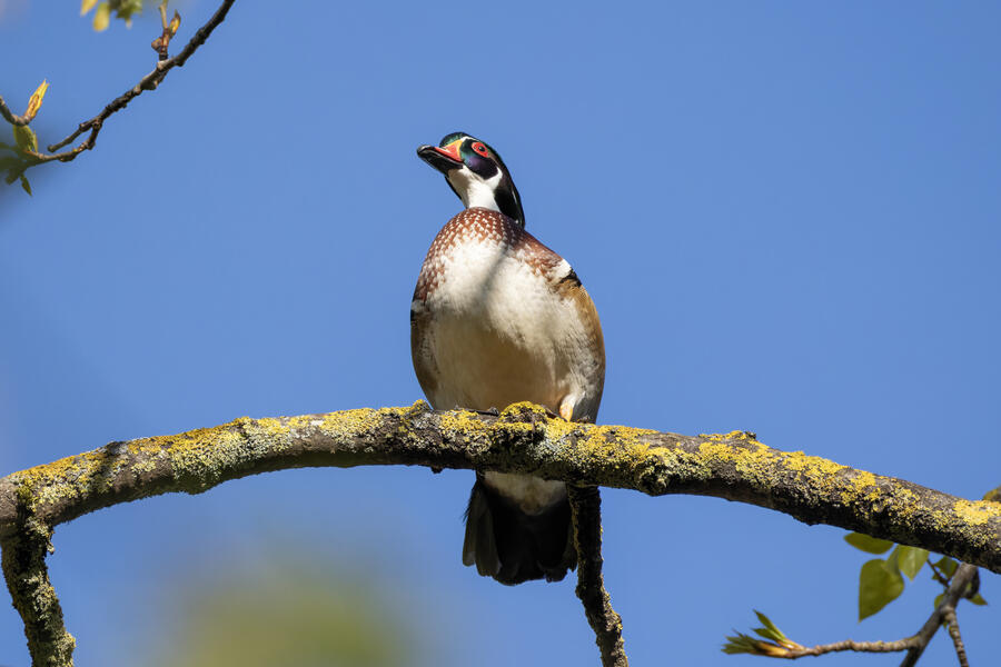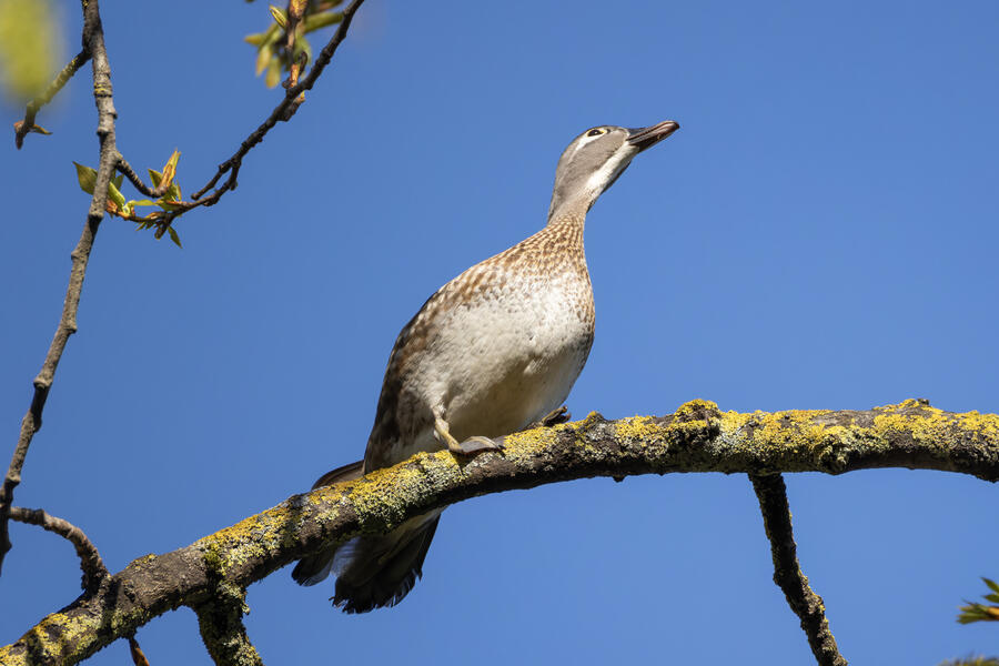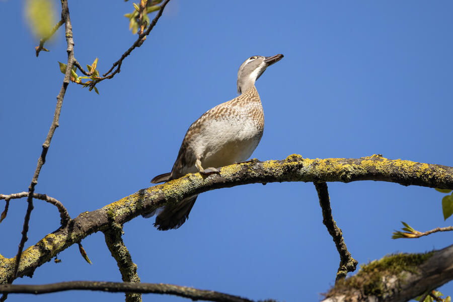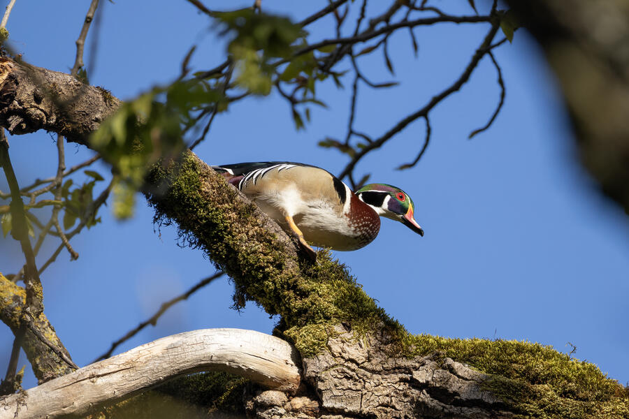 Wood DuckI saw a big thing in a tree, and my eyes couldn't make sense of what it was. After a look with binoclulars I was surprised to see a female Wood Duck above my head! I saw the male soon afterwards, and stepped away from a tree to get a better angle for a photo. I didn't see any nest cavity, and they were walking around quite a bit, perhaps exploring a few trees.