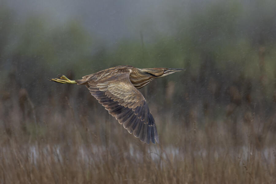 American BitternI used Lightroom Classic's generative remove feature to paint over a distracting stick ahead of the bird. I kept this photo a bit dark to highlight the rain visible in the shot.