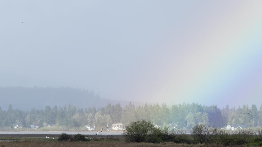 American White PelicanI probably could have spent longer looking at the rainbow, and waited for some birds to fly across it. This shot has some flying and some standing pelicans, so it turned out pretty cool!
