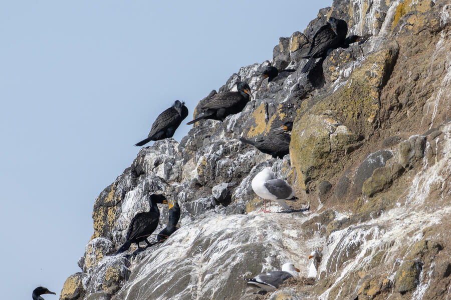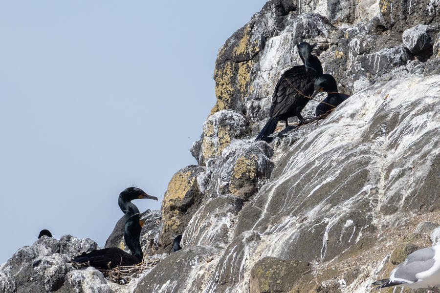 Western Gull, Double-crested CormorantThis is a distant shot, but it shows some nesting Double-crested Cormorants, and some perhaps-nesting Western Gulls.