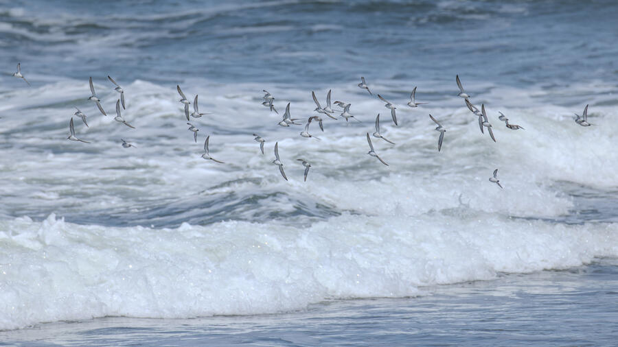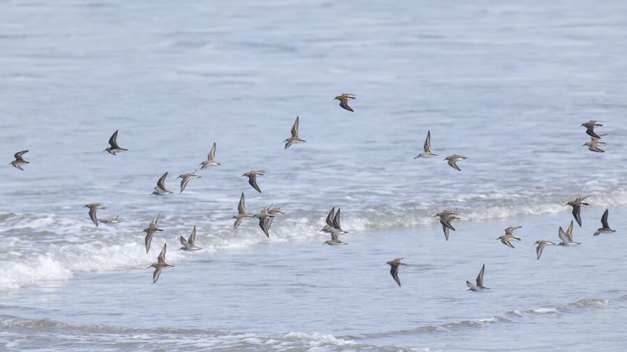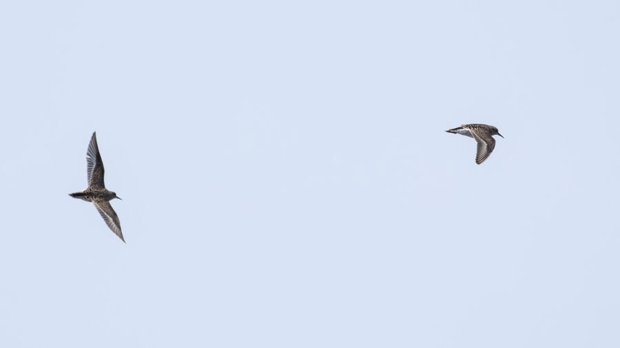 Western SandpiperThe right-most bird looks like a Least Sandpiper, but the rest are Western Sandpipers: they have slightly longer bills and brown triangle spots going farther down their flanks.