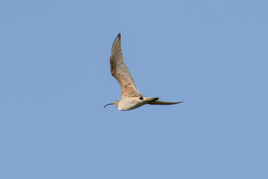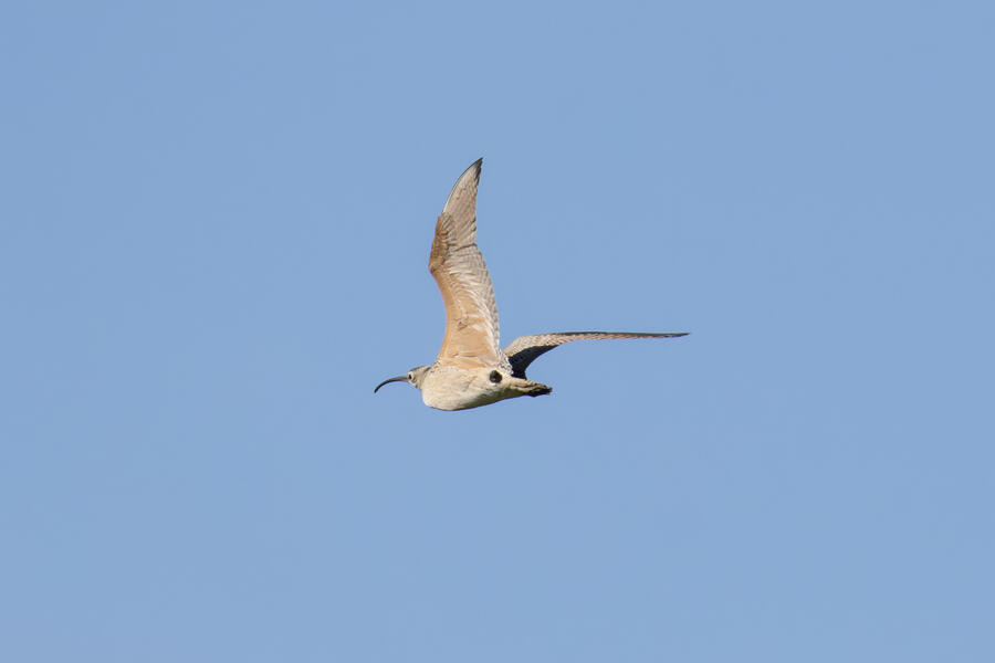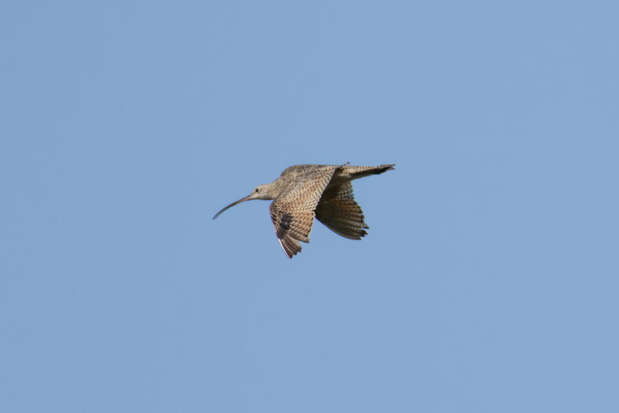 Shorebird season continues! I went out looking to see a rare Long-billed Curlew in the late afternoon. It had been reported all day by many people, so I thought my chances were pretty good. After a mile walk in the heat, I was somehow unable to see the large bird on the mudflats where I expected it to be foraging. As I was standing there entering something into my eBird checklist on my phone I heard loud cries of what sounded a bit like a gull. The calls took a few seconds to register in my brain, but then I had my camera up and began shooting photos of a pair of large birds flying off. Luckily, they briefly came back toward me before heading off for good. They must have been Curlews, but there were two of them! Nobody else had reported more than one all day. After double-checking my audio recording, and photos on the computer, it was definitely a pair of Long-billed Curlews. I would have loved to have watched them foraging on the ground for a while, but I guess it was fortuitous that I was present when they flew off (and that I was able to report two of them). The mudflats were surrounded by lots of areas with tall grass, so perhaps both were able to hang out somewhere out of sight for me, while one of them was able to avoid being spotted by everyone else.
