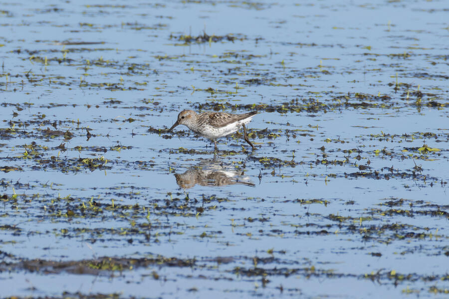 Western SandpiperDroopy longish bill and black legs. Breeding plumage adult shows reddish brown on the head and wing, and diagnostic triangular spots along flanks.