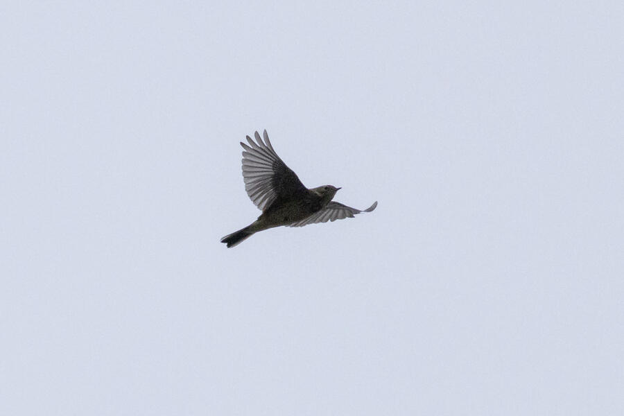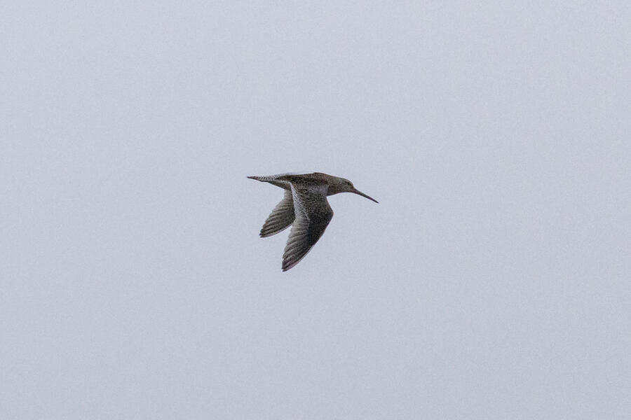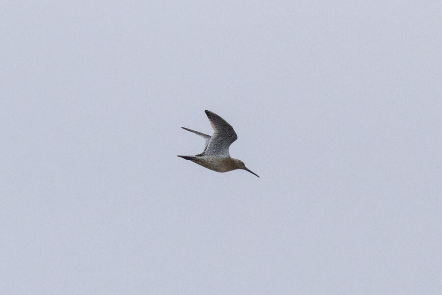 Short-billed DowitcherI heard a few distinct Short-billed Dowitcher calls as this bird flew by a couple times over a span of a few minutes. On the second flyby, I was ready and got some shots. Short-billed are pretty uncommon here (and very hard to distingish from Long-billed), so it was great to get a lone bird where I know which one it was! No barring is visible on the flanks, only light spotting. Otherwise, I'm not sure any real field marks are visible here.