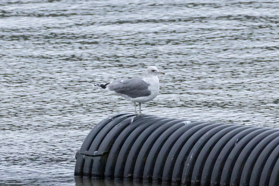 Western x Glaucous-winged Gull (hybrid)In person, the back and wingtips looked more pale gray. That lead me to believe this was an American Herring x Glaucous-Winged "Cook Inlet" gull, but the photos show a bit more color in the back and wingtips, and the bill is a bit too orange and bulbous. I've changed my mind and am calling this a Western x Glaucous-Winged "Olympic" gull.