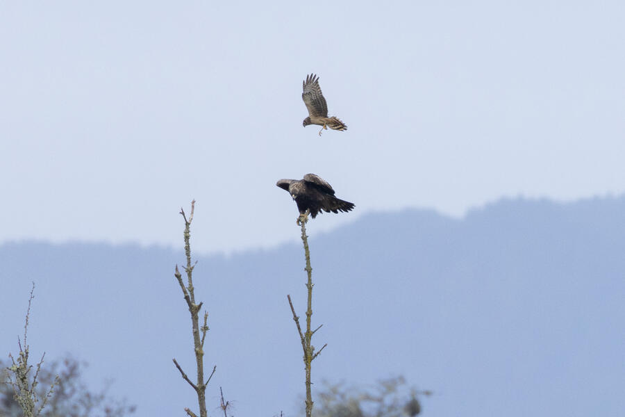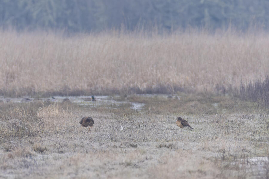 Red-tailed Hawk, Northern HarrierA Red-tailed Hawk eating something while a Northern Harrier watches and waits from a safe distance.