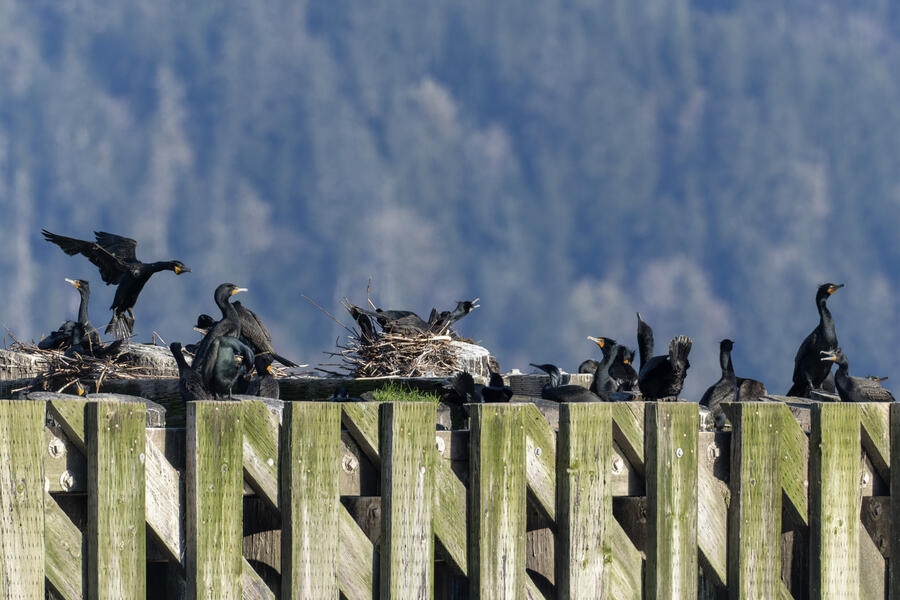 Double-crested Cormorant, Brandt's CormorantAs far as I could tell, of the hundreds of cormorants sitting and nesting on the bridge piers, just about all were Double-crested Cormorants and these couple dozen were Brandt's Cormorants. There's a plastic dummy falcon there, an ineffictive one I'd say, as well.