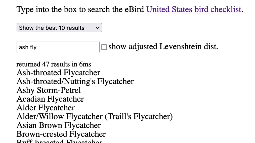 I tested out algorithms for finding partial string matches of bird species names, and