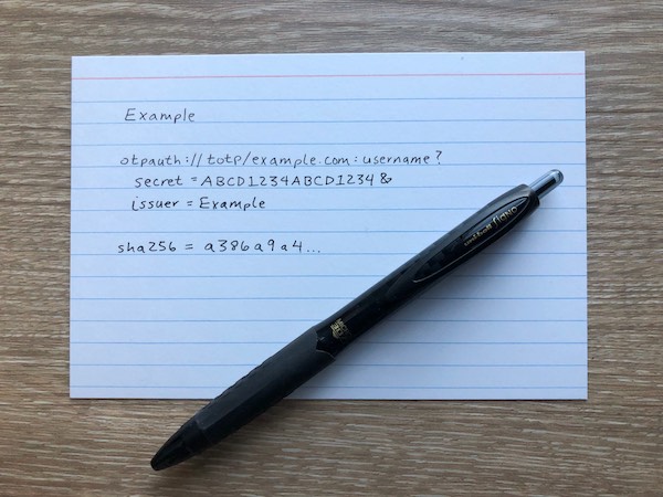 For writing the TOTP secrets I prefer to use Uni-ball Signo 307 pens and archival quality index cards. (These links are Amazon affiliate links, and by clicking them and purchasing those products you'll support this site.)