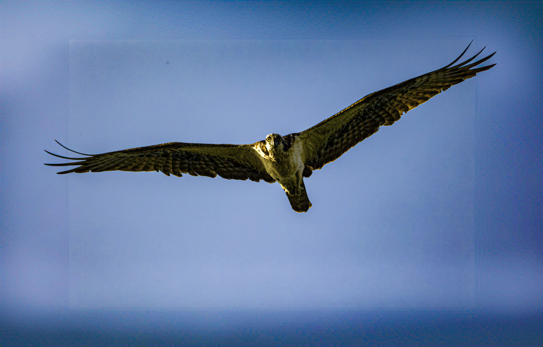 This means that further edits to the image could potentially reveal this lack of continuity from the original sky pixels to the drawn-in pixels. This is less of an issue if generative fill is applied as the final step, but I felt like the sky wasn't good enough to be used in the final image. Instead, I created an entirely new sky gradient using the original sky colors, added some noise, and then pasted the Osprey on top of that: