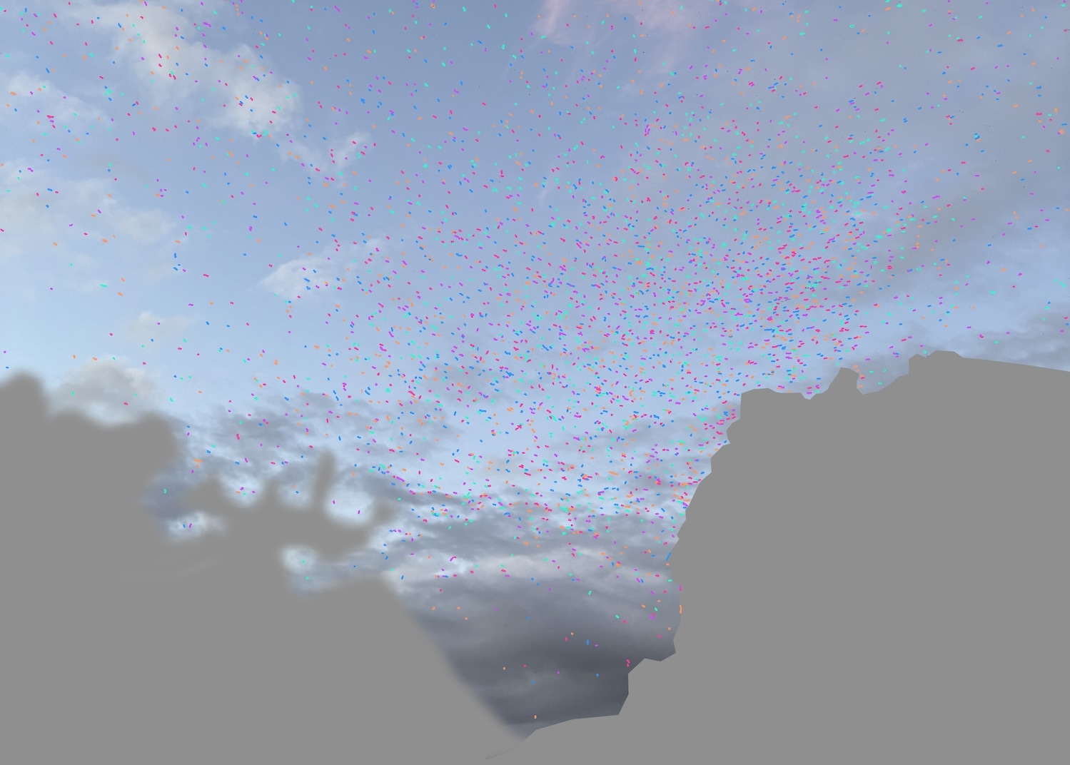 Running the script on the full image returned a count a bit over 5,000. The verification image showed that a few high-contrast areas in the clouds and along the image edges had been counted, so I painted over those areas and tried the script again.