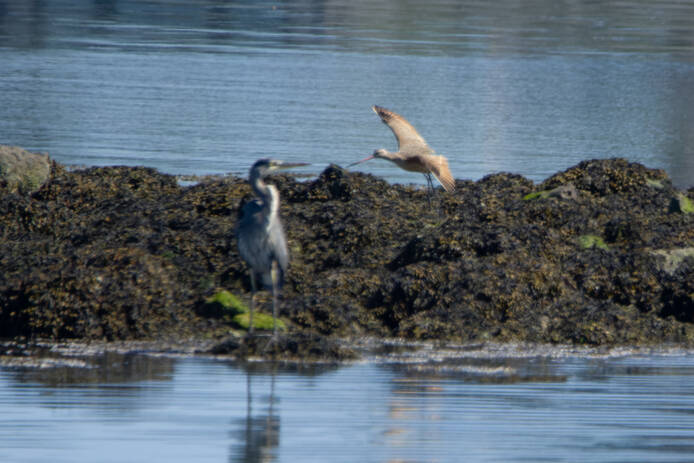 Earlier in the day, while walking on the beach, I came across a Marbled Godwit. There were people very close to it so perhaps it would have been a good photo opportunity, but I didn't have my camera at that time. After waiting around at the jetty for a while to see what would turn up, another (the same?) Marbled Godwit flew in and landed next to the Great Blue Heron that was fishing there.