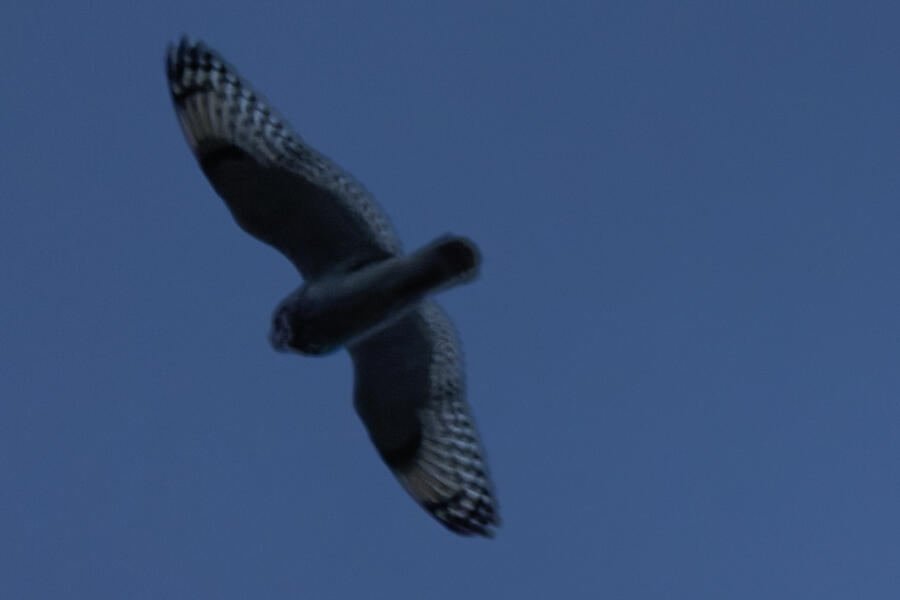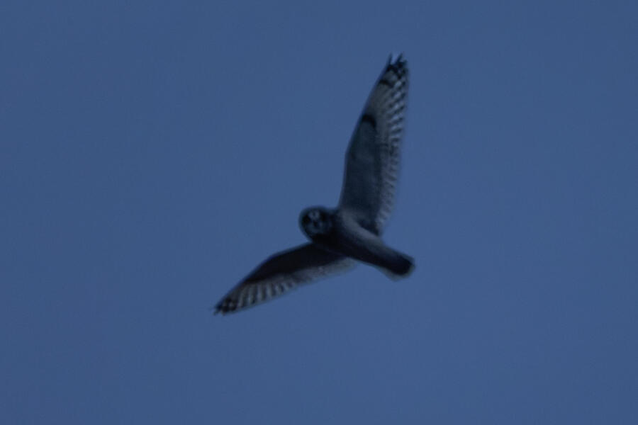 I'd seen many reports of Short-eared Owl at the local wildlife area. On a relatively dry evening, at sunset, I took my nearly 4-year-old daughter and we went looking. I saw a few Northern Harriers hunting there, and after about 20 minutes, when it started getting quite dark, I was lucky enough to spot a definite non-harrier pretty high overhead. In the camera I could only make out the silhouette, but the shape of the head/neck indicated owl! It kept a good altitude as it flew away, and it didn't return. I'll have to go back to try to get better photos. Upon reviewing the photos on the computer, it was definitely a Short-eared Owl looking down at us. I could make out a few pixels of its yellow/orange eyes in a couple of the shots.