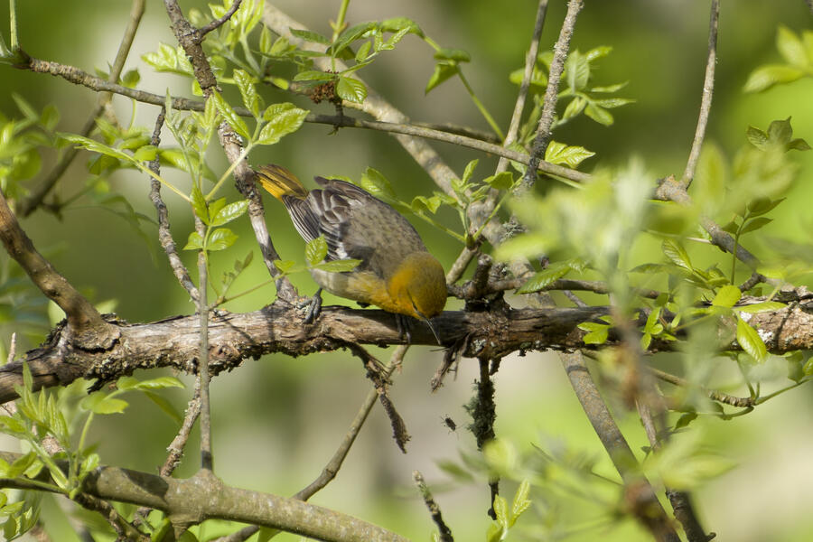 A male and female were foraging in a tree, very actively moving from branch to branch. The male was a brilliant orange. I'm not sure how these brightly colored, loud birds eluded me on my previous outings last year to the same location to find them. They were up in a tree but I, standing on the hillside, was slightly above them. I enjoyed standing there for 10 minutes or so and took a bunch of photos.