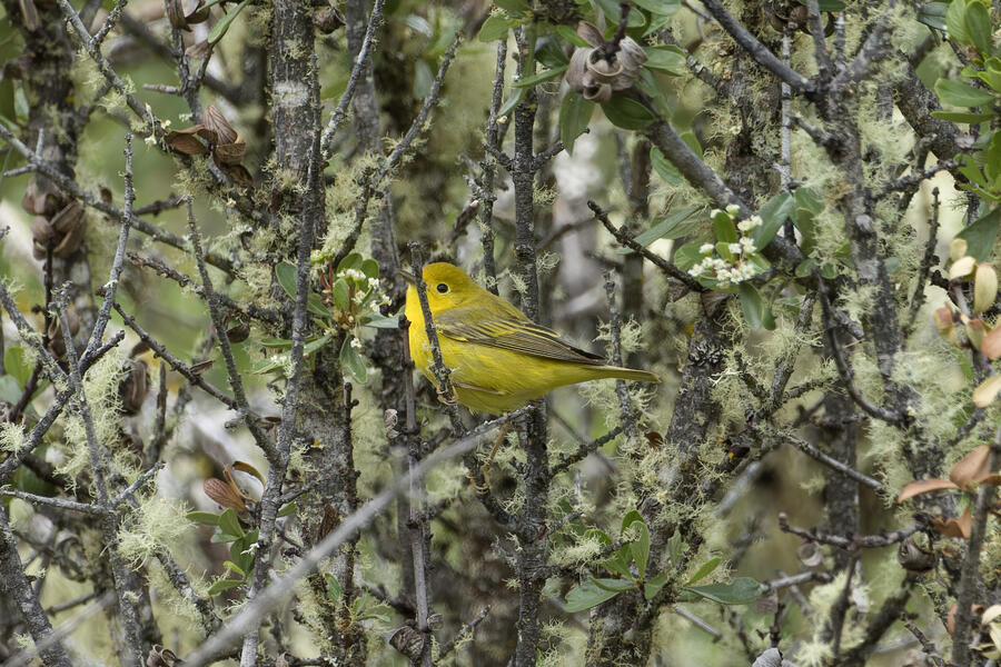 Yellow WarblerI initially wasn't sure if this was a young female Wilson's Warbler, or a Yellow Warbler. Since the bill is dark, and the tertials have bright yellow edges, and since I believe it's not really possible to see a young female Wilson's (without a black cap) this time of year, I think I can safely say this is a Yellow Warbler. This is cool because I've hardly photographed these birds!