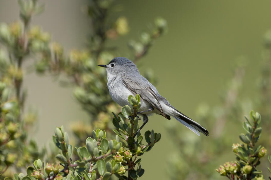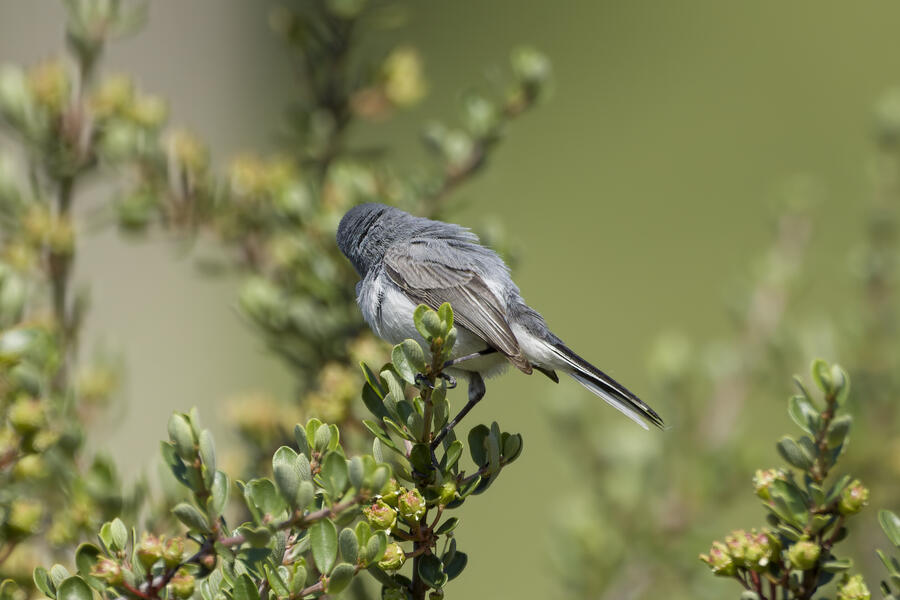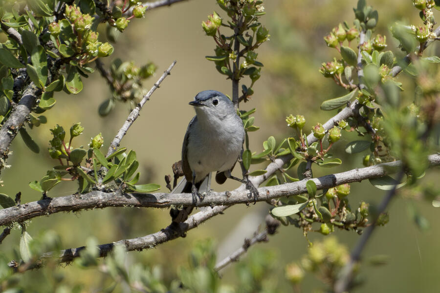 I waited at the location for a few minutes before hearing, barely, a soft Gnatcatcher song or call. A few minutes later a male started singing and flying around from perch to perch. He was easier to spot. I only got around three minutes where I was able to see him and take photos. He was about the size and shape of a Bewick's Wren, but had coloring more like a White-breasted Nuthatch. A very cool bird! I'll have to try to find these birds again next year, a few weeks earlier in the spring, when they're out in the open singing more often.