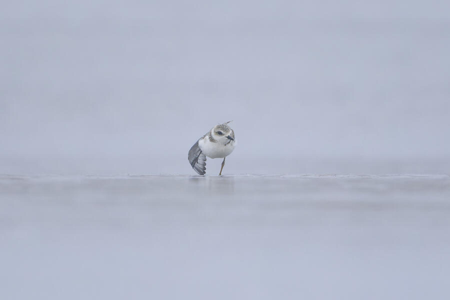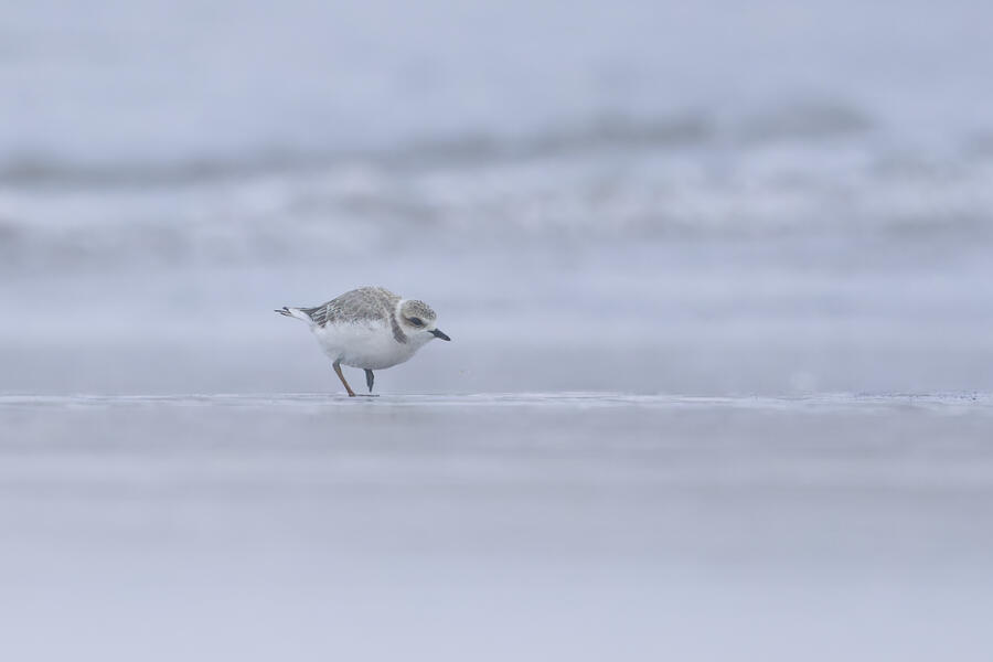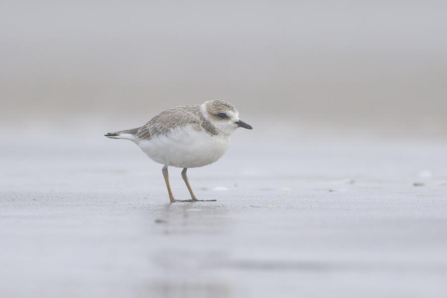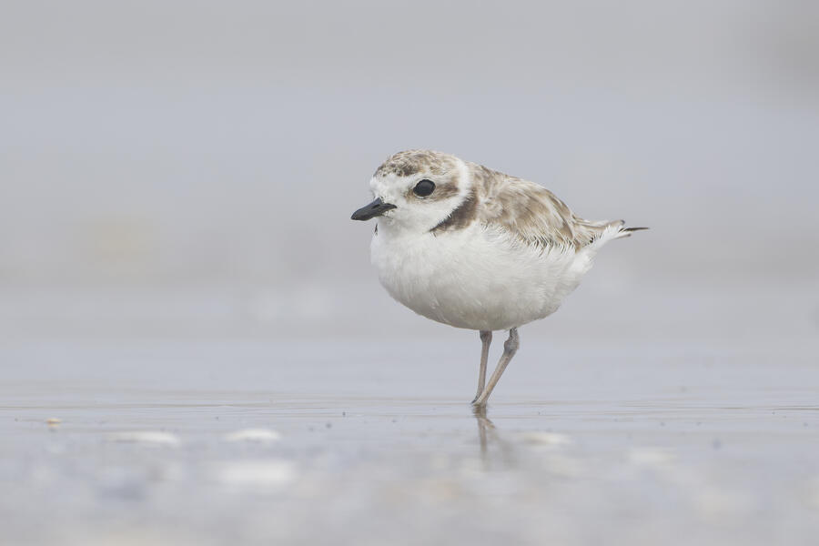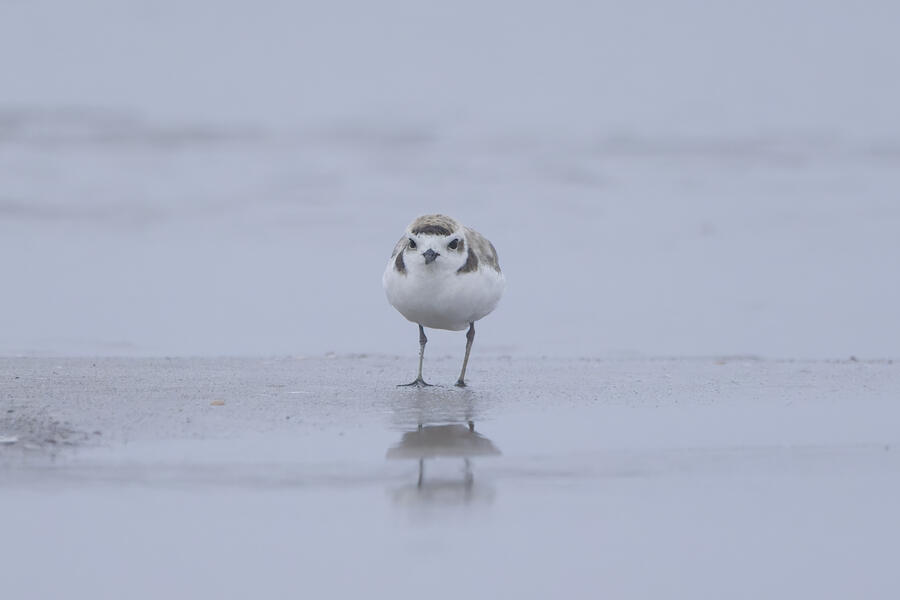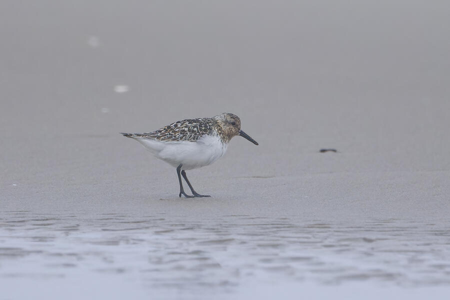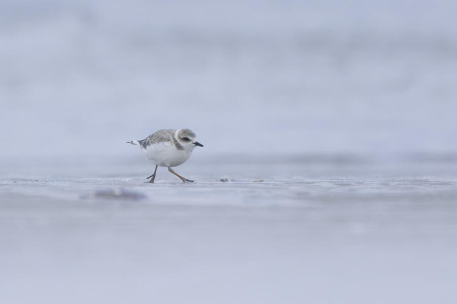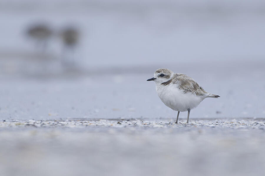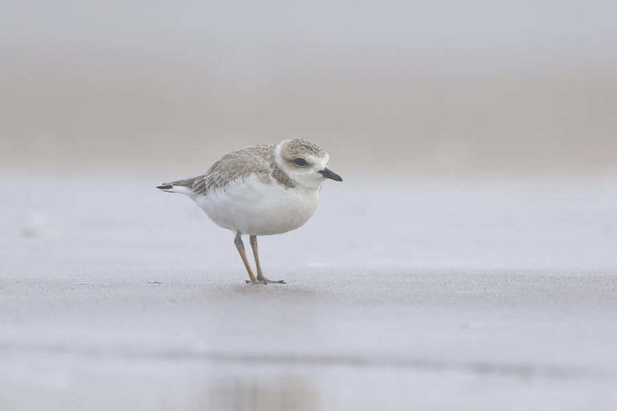 When I pulled into the parking lot around 6:30am it was in the mid-50s and foggy. I walked over the dune separating the parking area from the beach and saw signs and roped-off areas for Snowy Plover nesting. That was a good sign! I quickly saw a small group of peeps gathered around a small tide pool. Right away I saw a few little whiteish birds here and there, and a quick look with binoculars showed them to be Snowy Plovers! It was hard to count them since the were running around a bit and blending into the crowd of Western Sandpipers, but I saw two or three. I put a mat down on the sand to lay on, and a flat dish to stabilize my camera, and I got down on my belly and elbows. I was very lucky — first that the birds were right there next to the parking area, and secondly that as I lay there for an hour or so they sometimes got pretty close. After laying there for a while taking several hundred shots, I walked down the beach for a few minutes. I think I saw 10 total Snowy Plovers, defintely at least 8. They are such charasmatic little birds!
