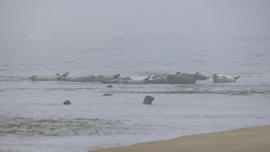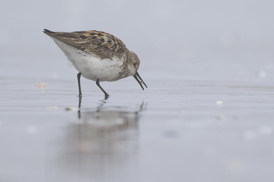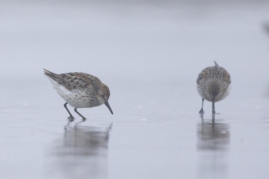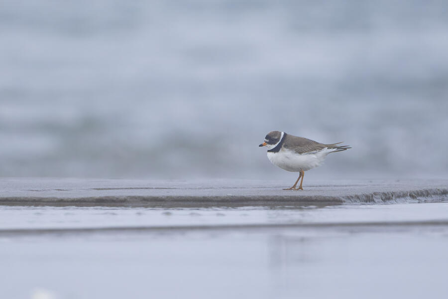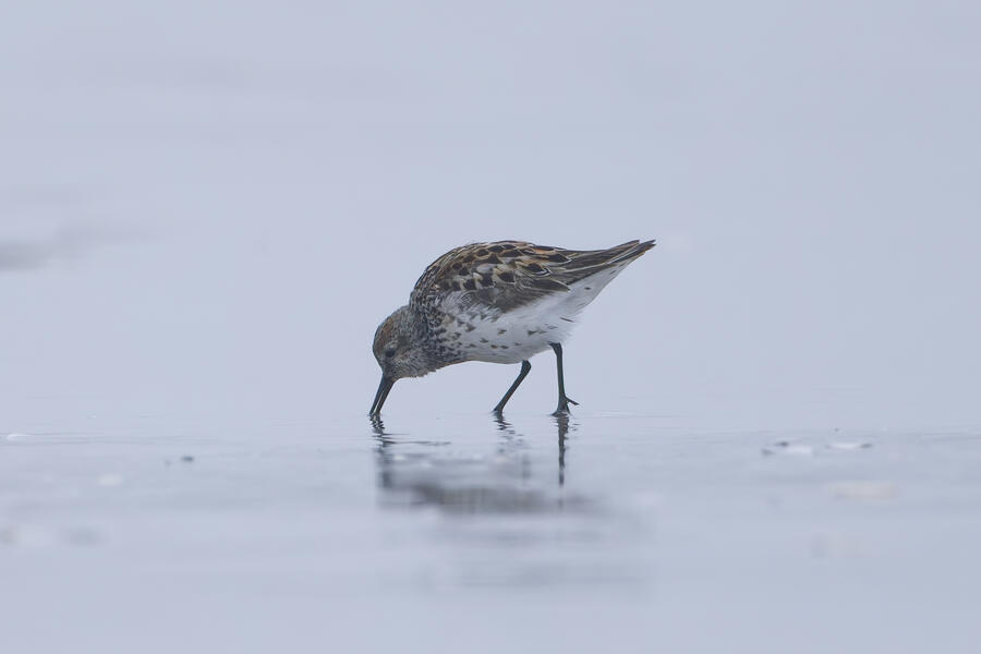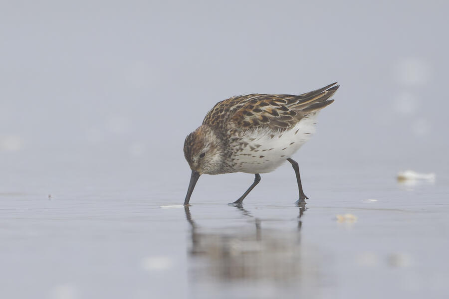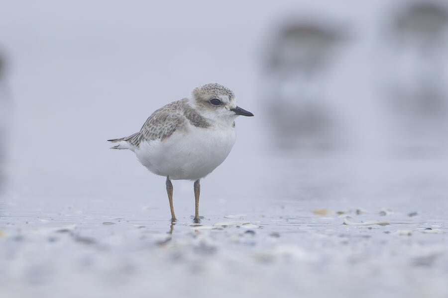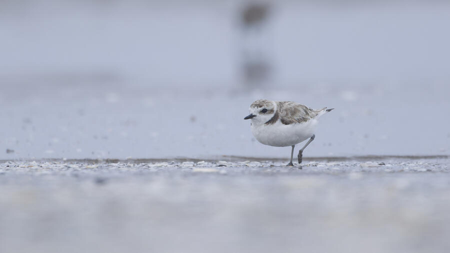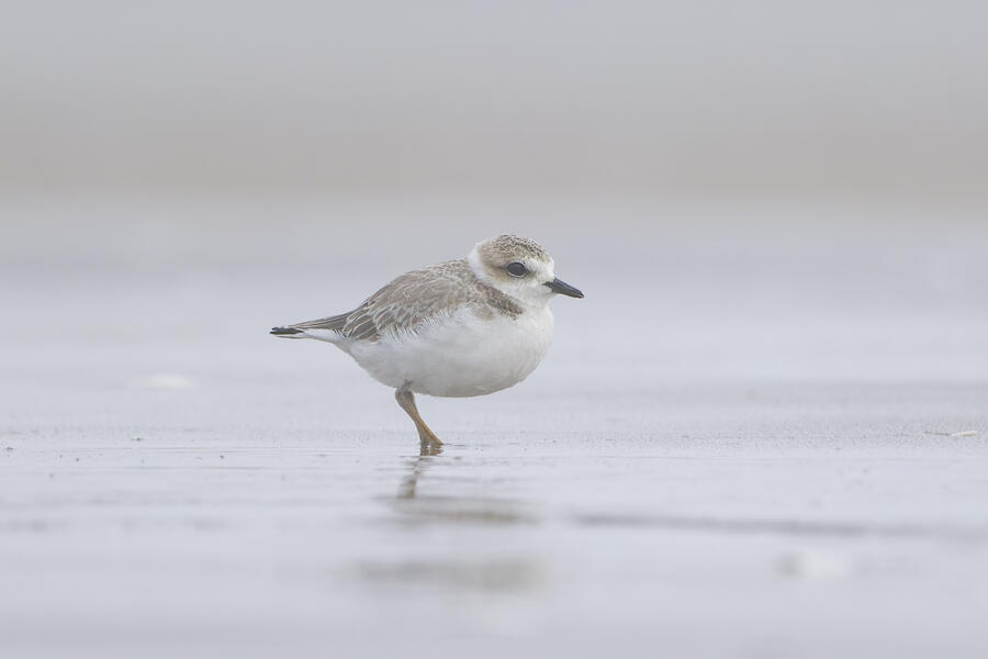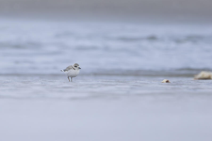 When I pulled into the parking lot around 6:30am it was in the mid-50s and foggy. I walked over the dune separating the parking area from the beach and saw signs and roped-off areas for Snowy Plover nesting. That was a good sign! I quickly saw a small group of peeps gathered around a small tide pool. Right away I saw a few little whiteish birds here and there, and a quick look with binoculars showed them to be Snowy Plovers! It was hard to count them since the were running around a bit and blending into the crowd of Western Sandpipers, but I saw two or three. I put a mat down on the sand to lay on, and a flat dish to stabilize my camera, and I got down on my belly and elbows. I was very lucky — first that the birds were right there next to the parking area, and secondly that as I lay there for an hour or so they sometimes got pretty close. After laying there for a while taking several hundred shots, I walked down the beach for a few minutes. I think I saw 10 total Snowy Plovers, defintely at least 8. They are such charasmatic little birds!